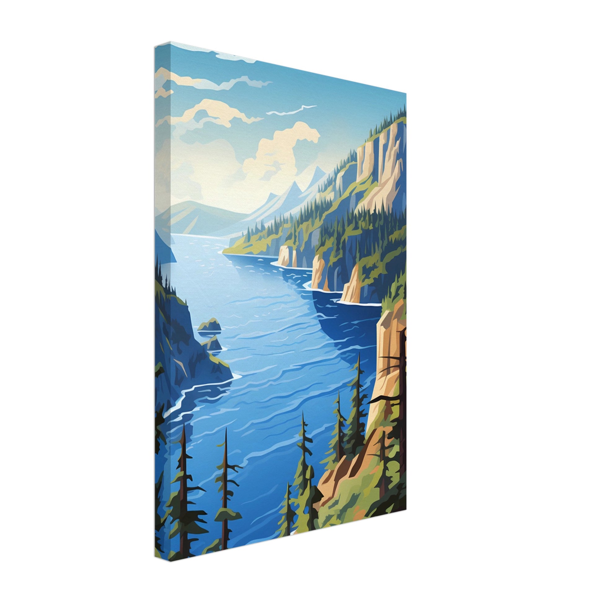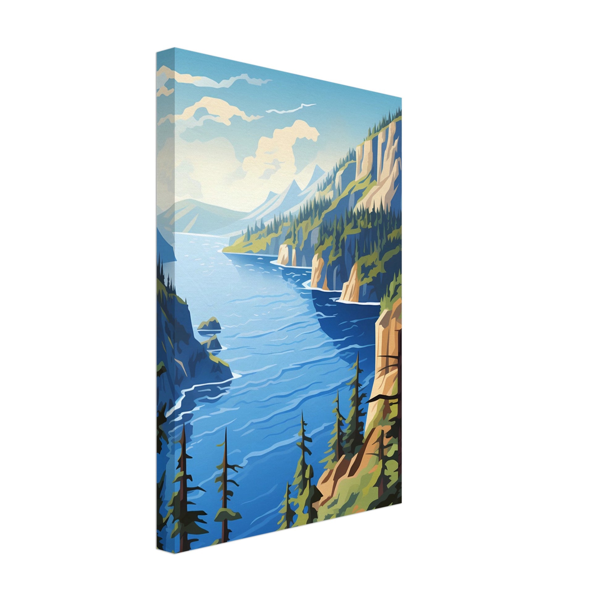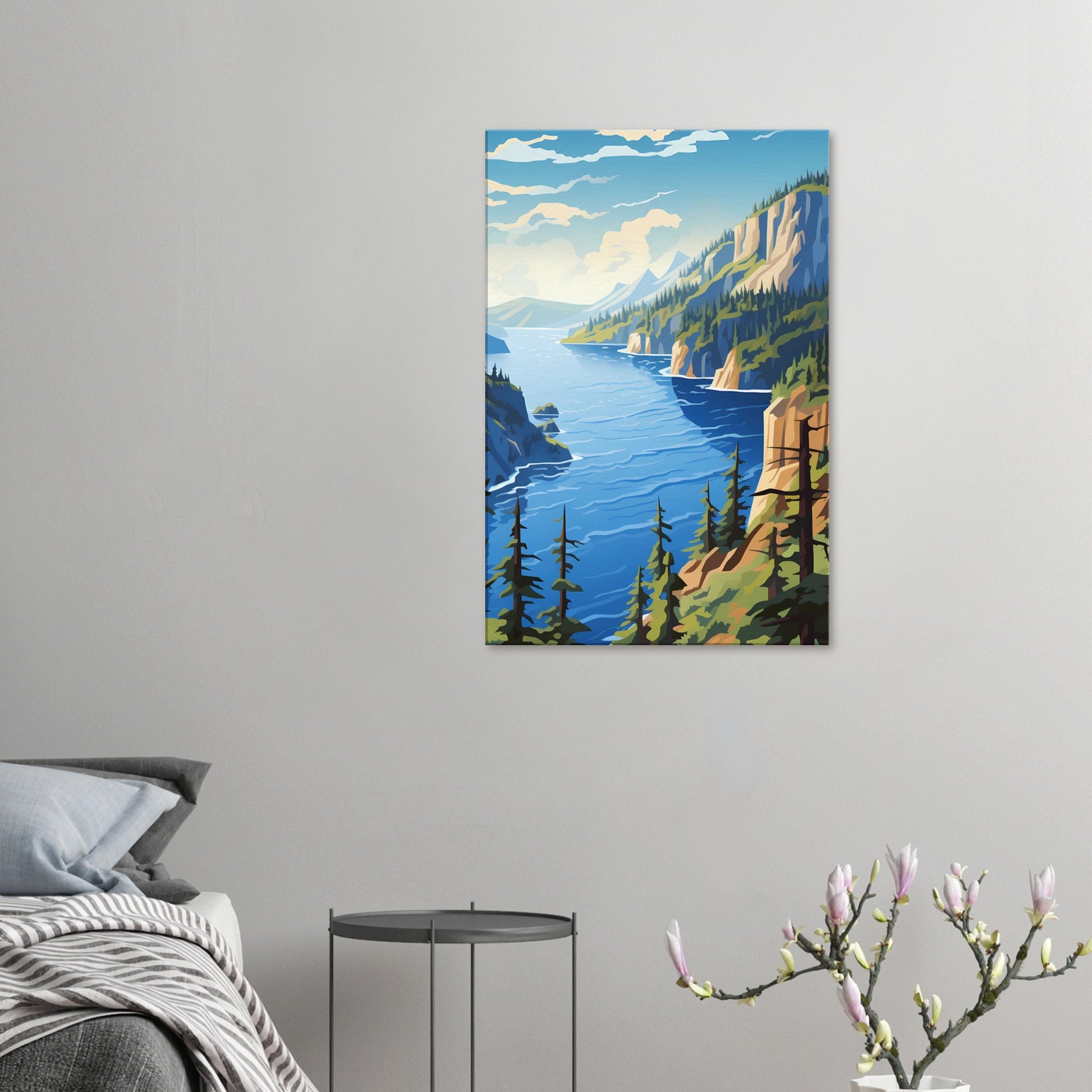 "Crater Lake Oasis" transports viewers to an untouched National Park paradise. The still blue waters, surrounded by lush greenery and towering cliffs, make for a serene escape. Hang this to bring the tranquility of nature indoors.