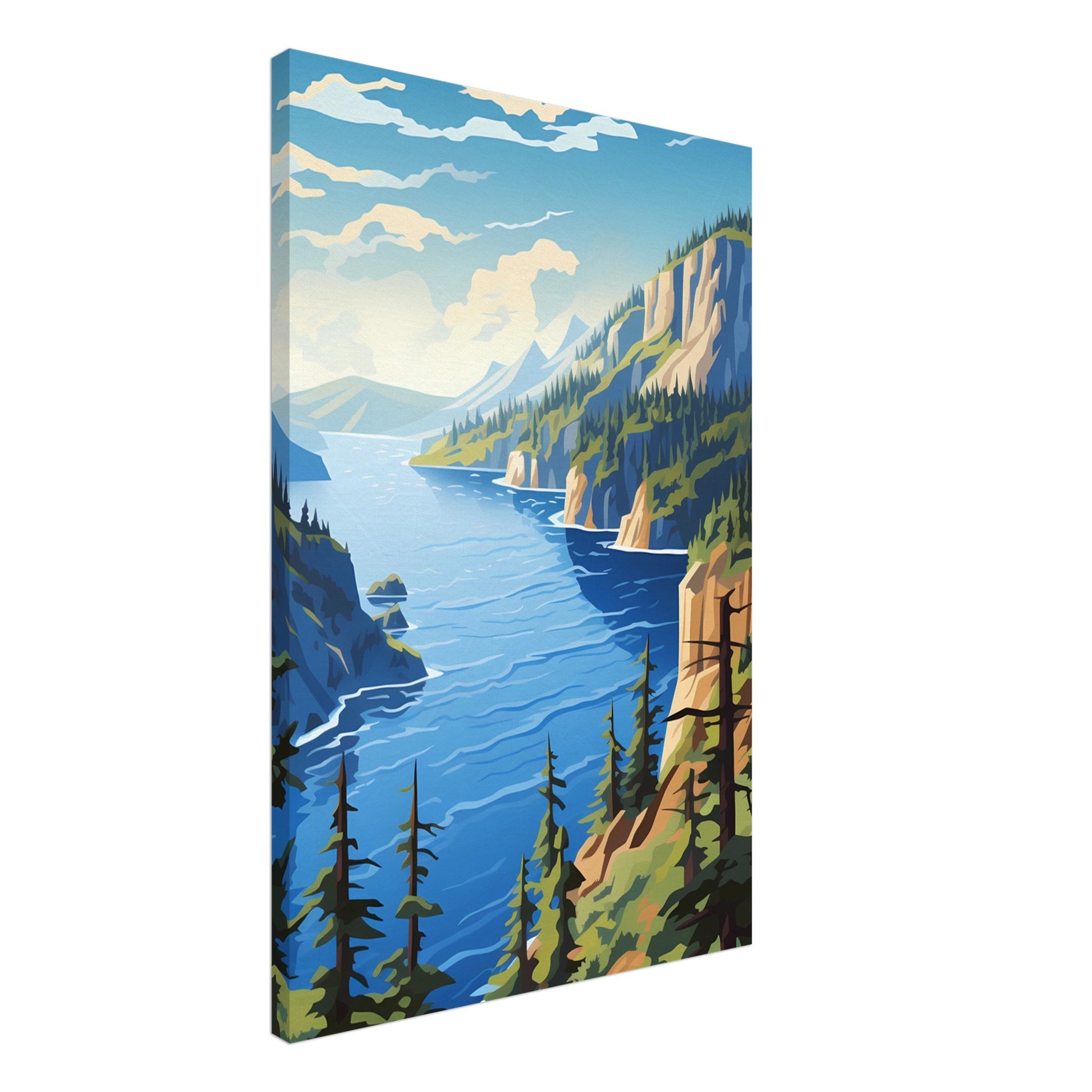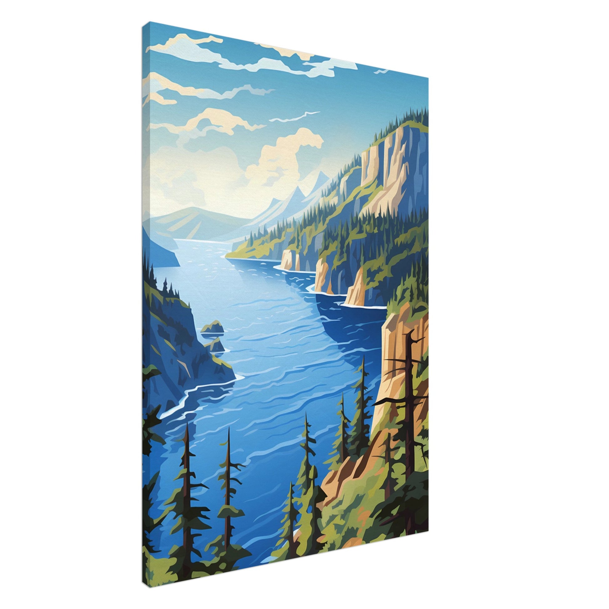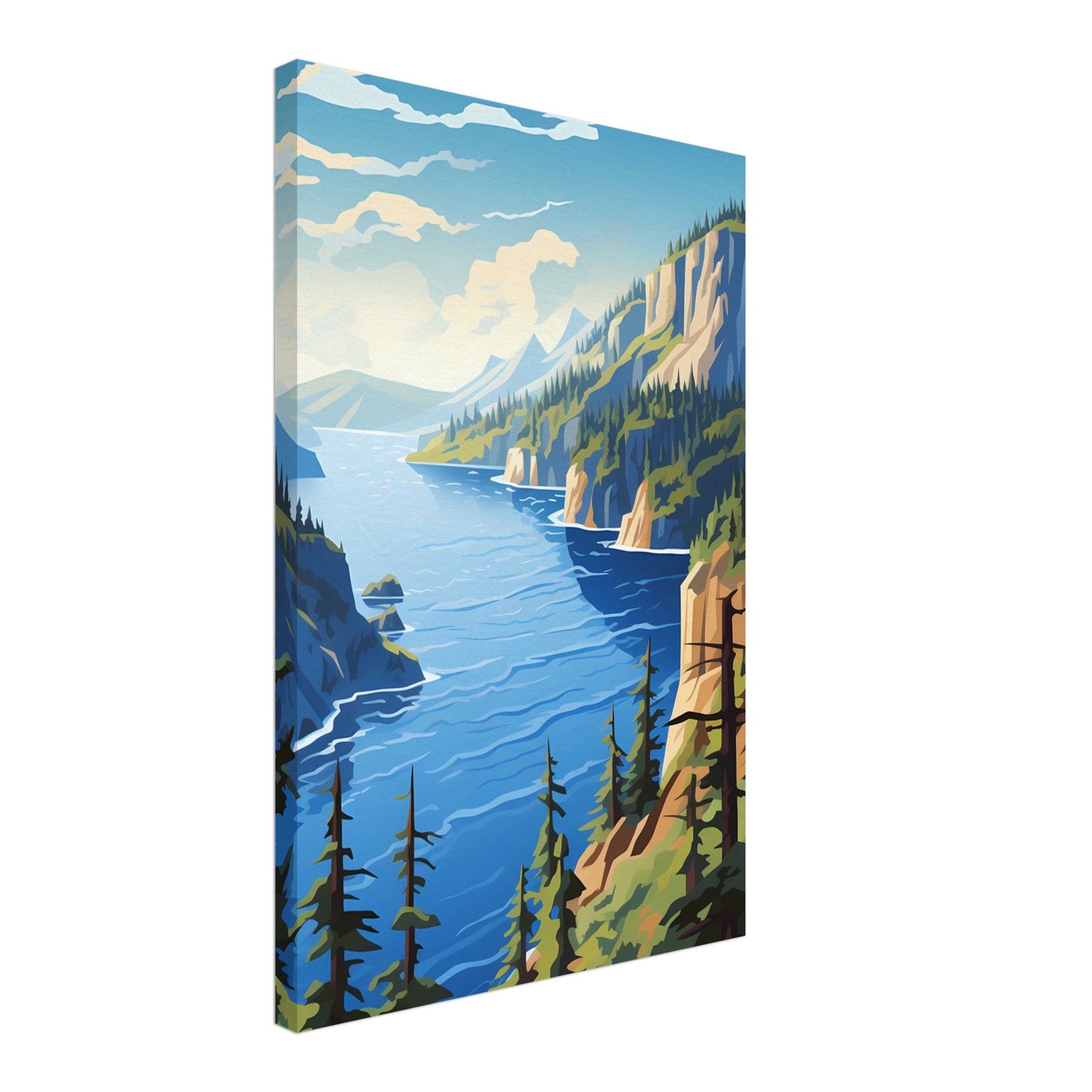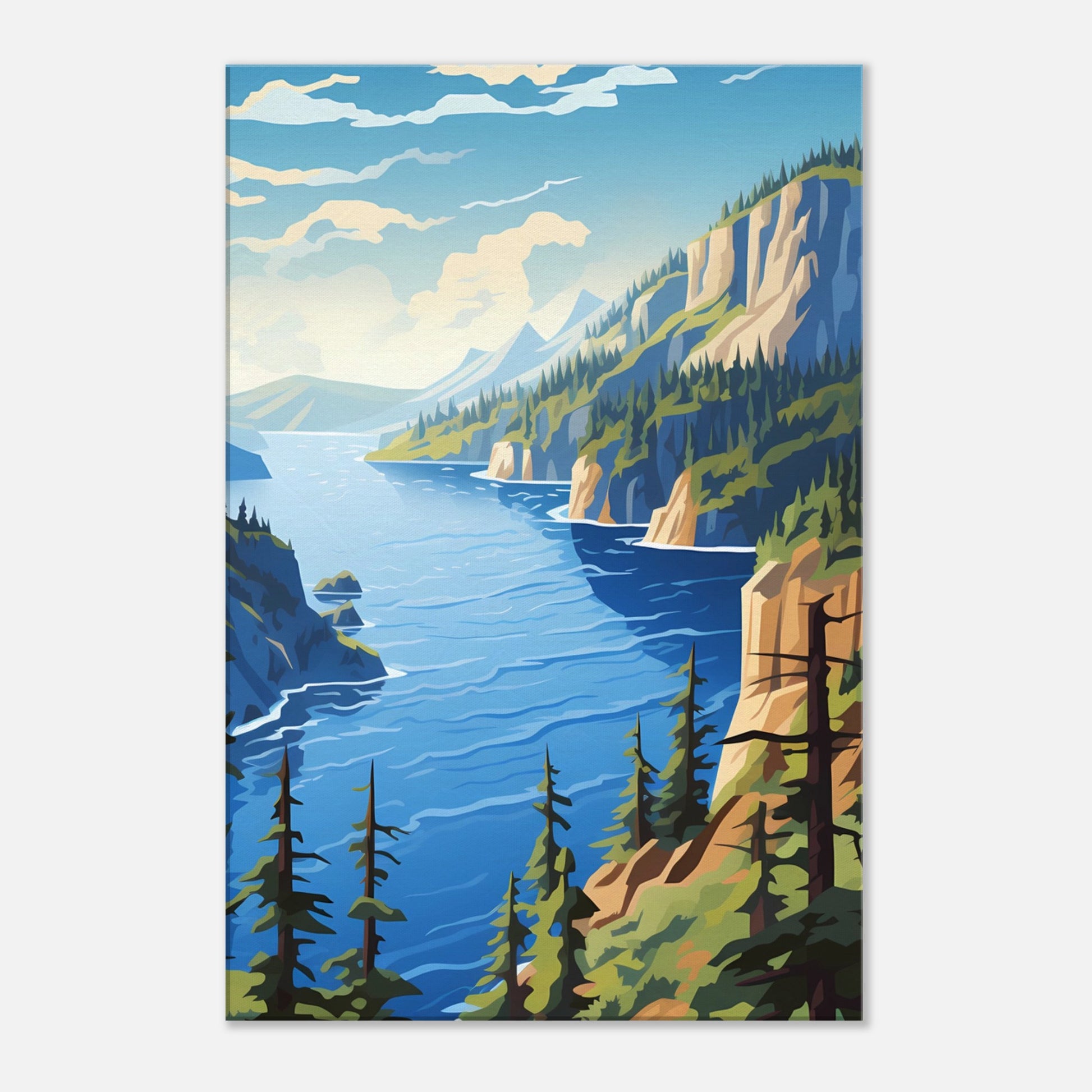 "Crater Lake Oasis" transports viewers to an untouched National Park paradise. The still blue waters, surrounded by lush greenery and towering cliffs, make for a serene escape. Hang this to bring the tranquility of nature indoors.