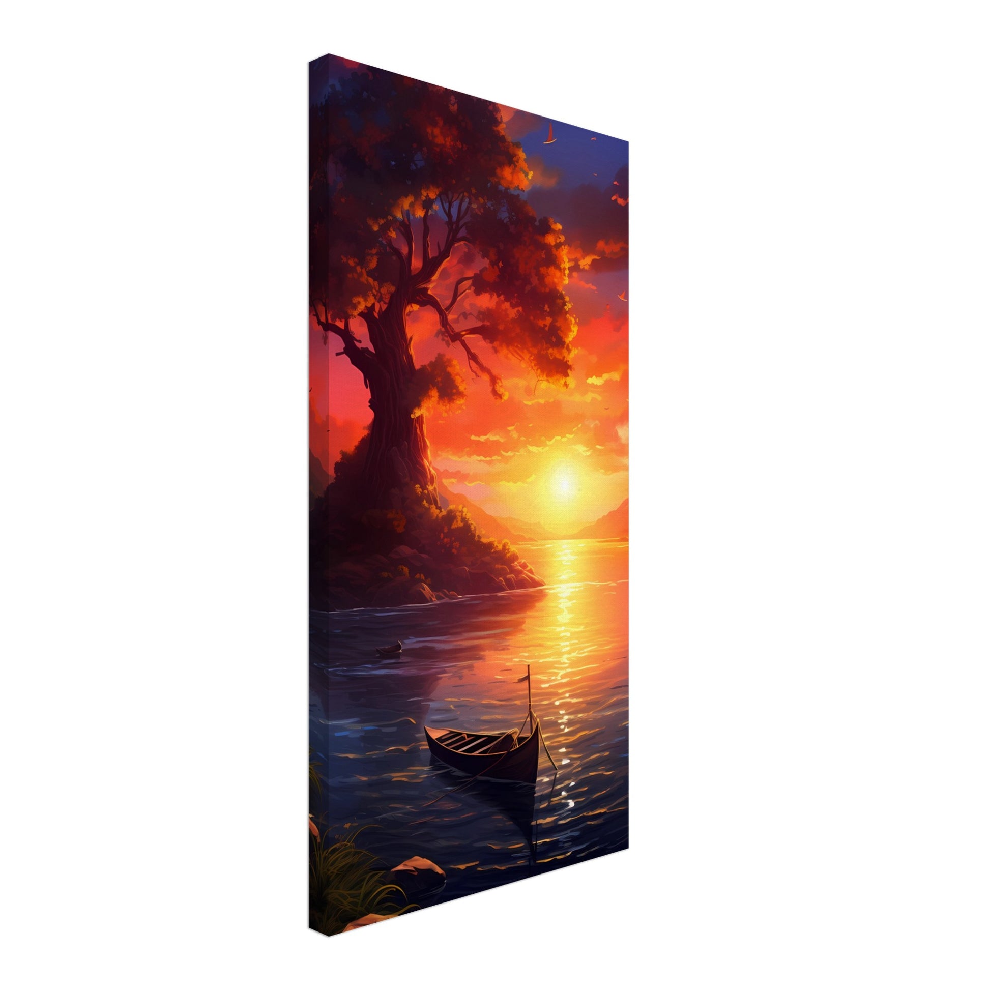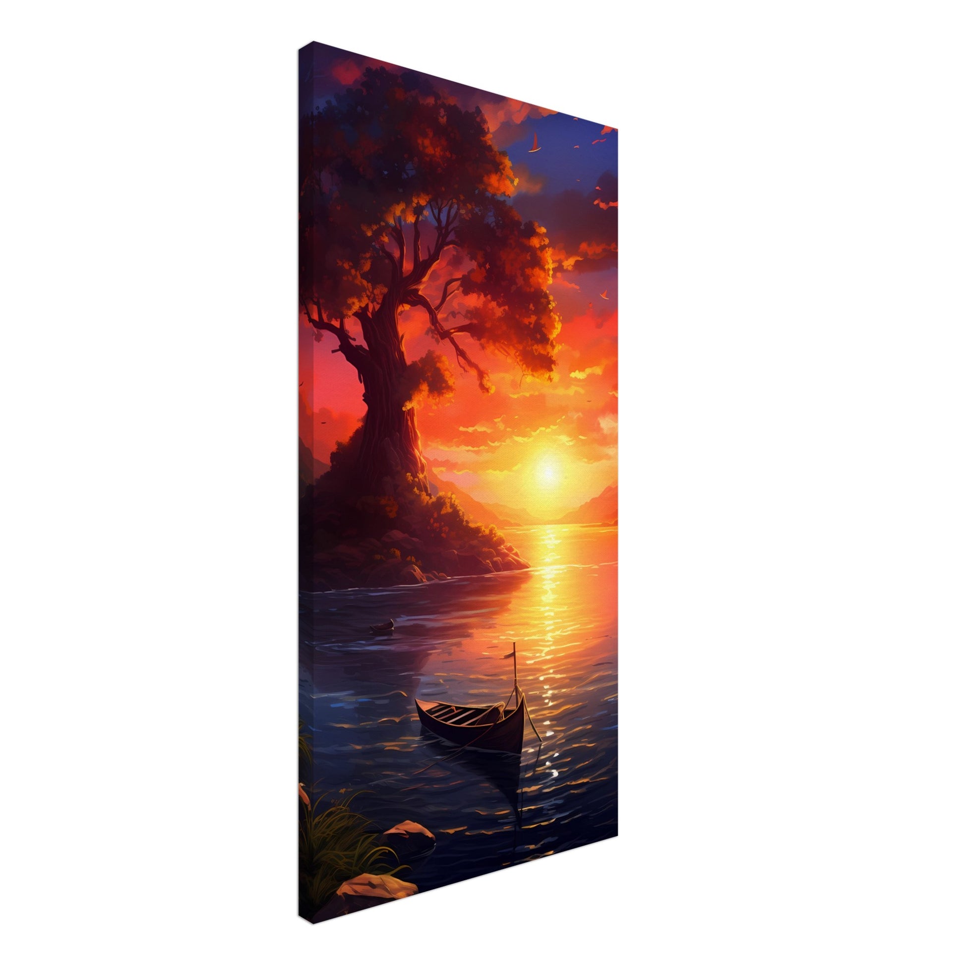 Embark on a journey of solitude with the "Solitary Sunset Serenade" canvas art design. A lone tree stands tall on a rocky outcrop, bathed in the radiant glow of the setting sun. The calm waters, the drifting boat, and the fiery sky converge to create a symphony of colors, evoking feelings of peace and nostalgia.