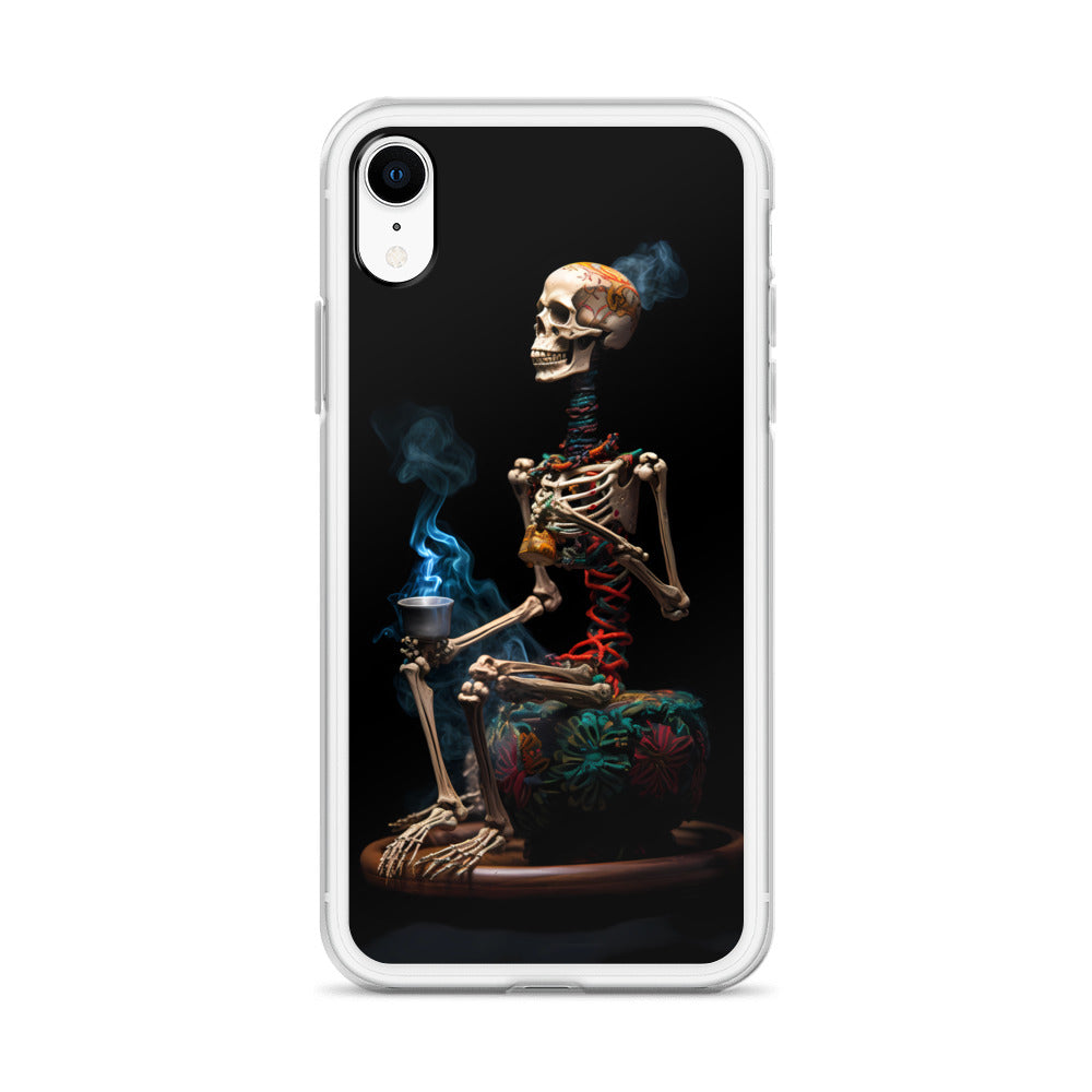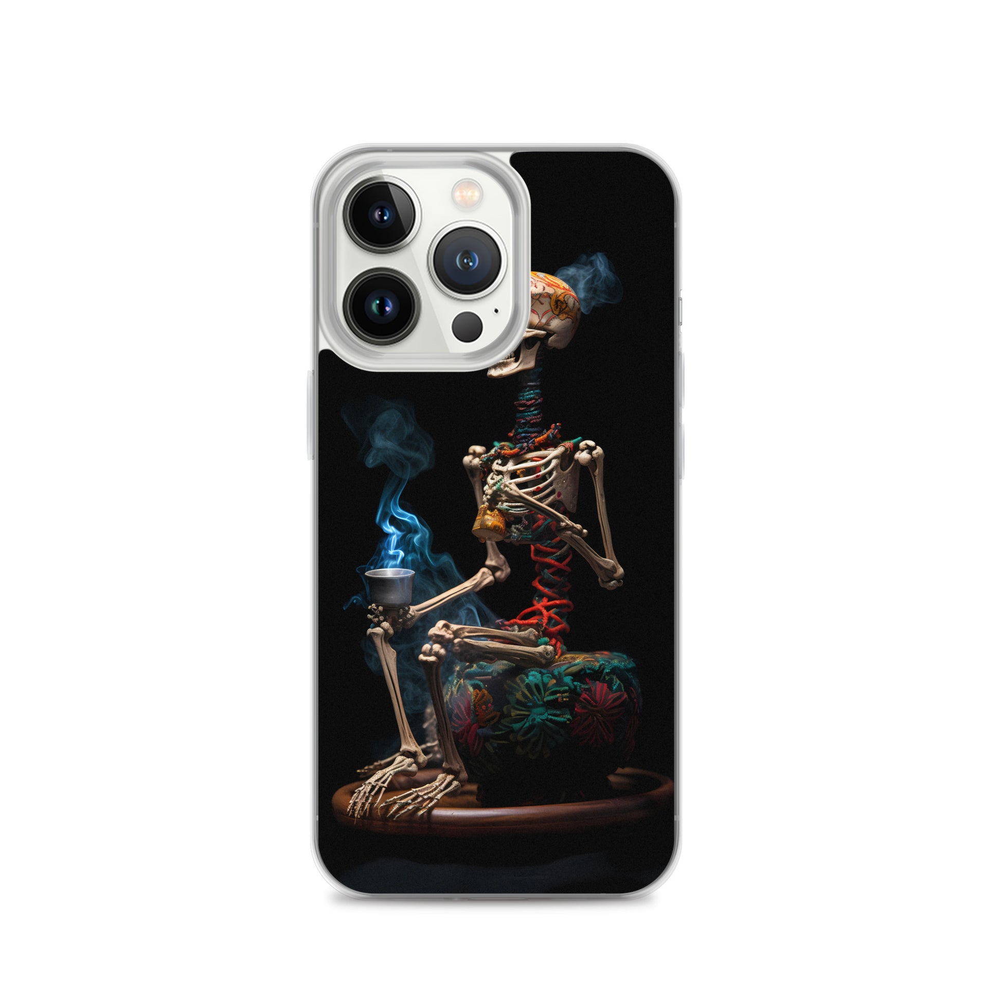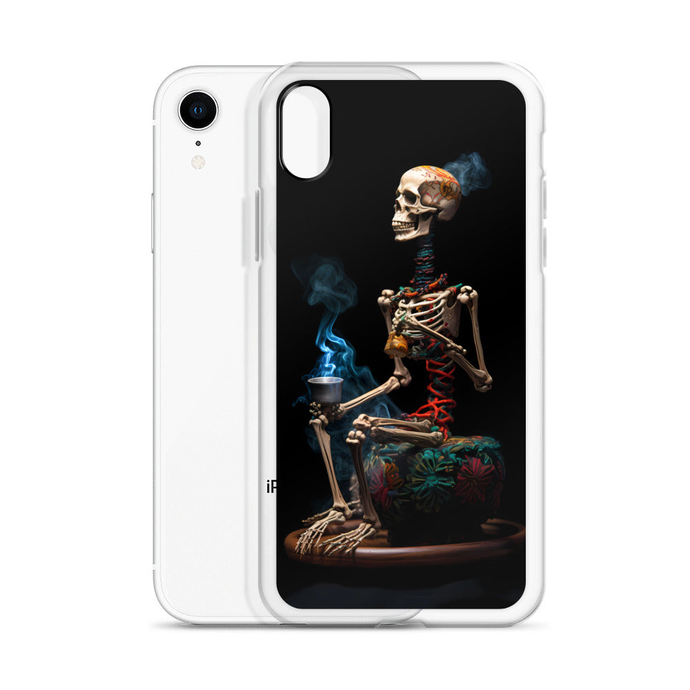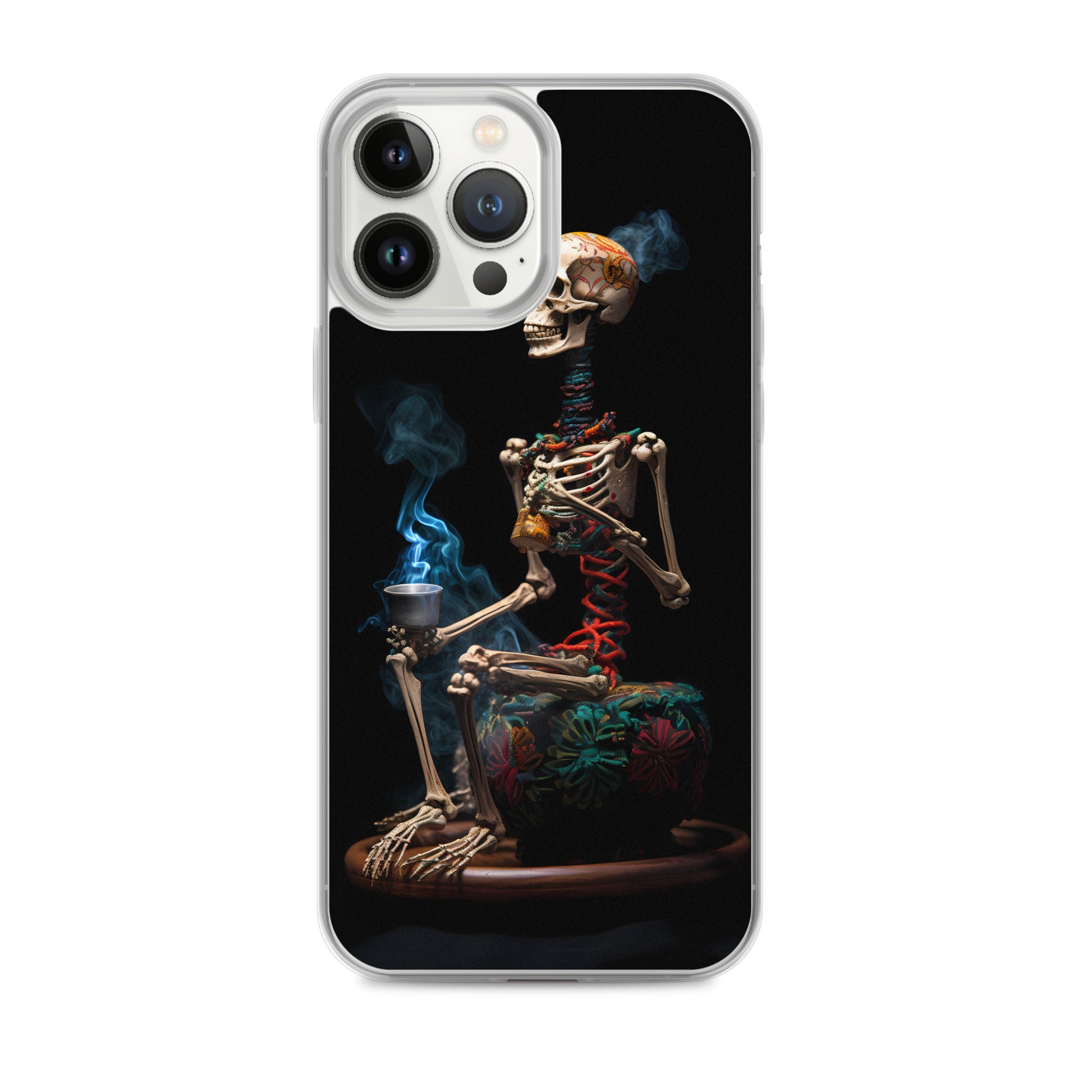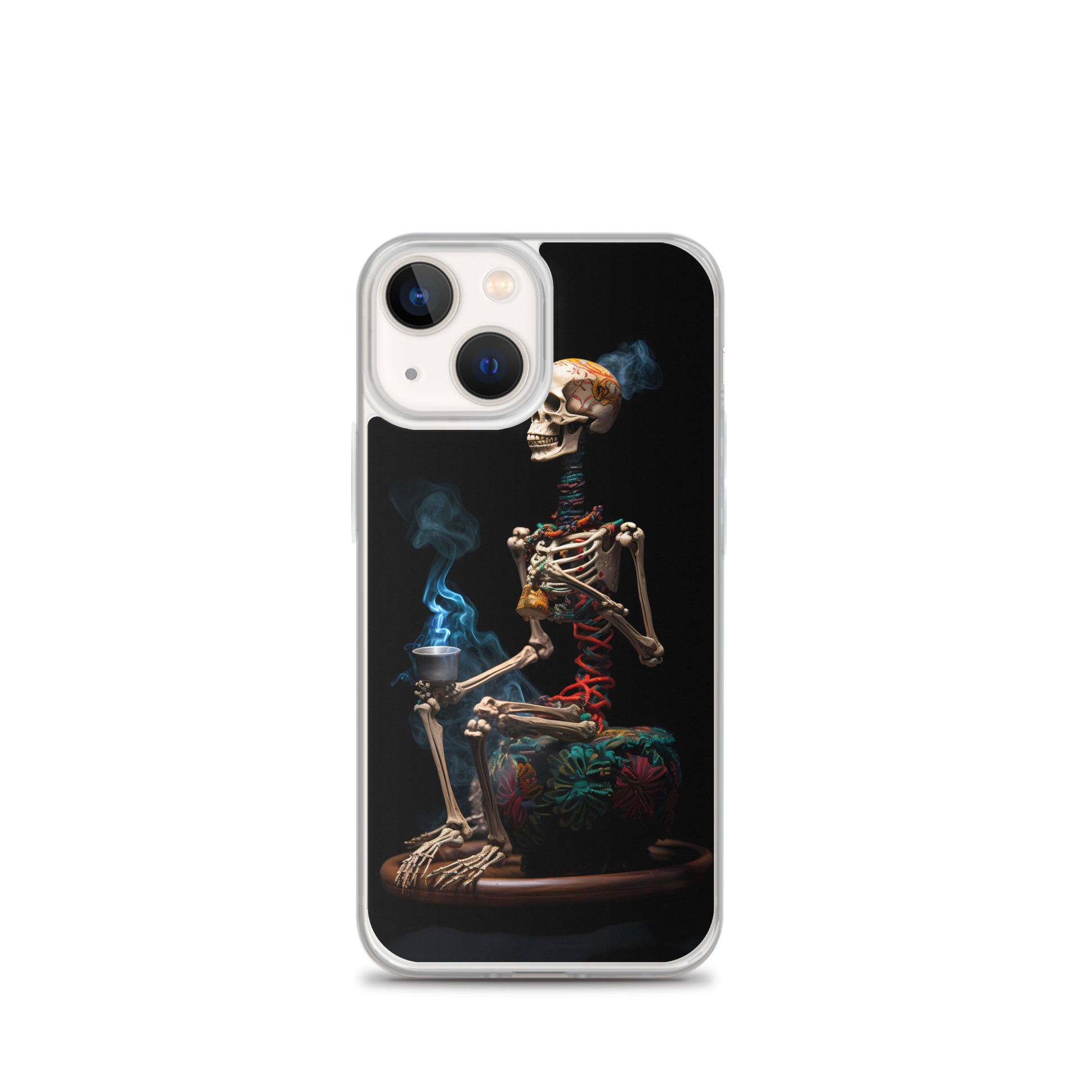 Elevate your phone style with the "Dream Smoke" Seated Skeleton iPhone Case. Inspired by hazy, dreamlike qualities, this case features a meticulously detailed still life of a skeleton sitting and smoking a cigarette. The dark humor graphic prints and symbolic props add a unique touch to the surrealist and colorful design, making it a conversation starter wherever you go.