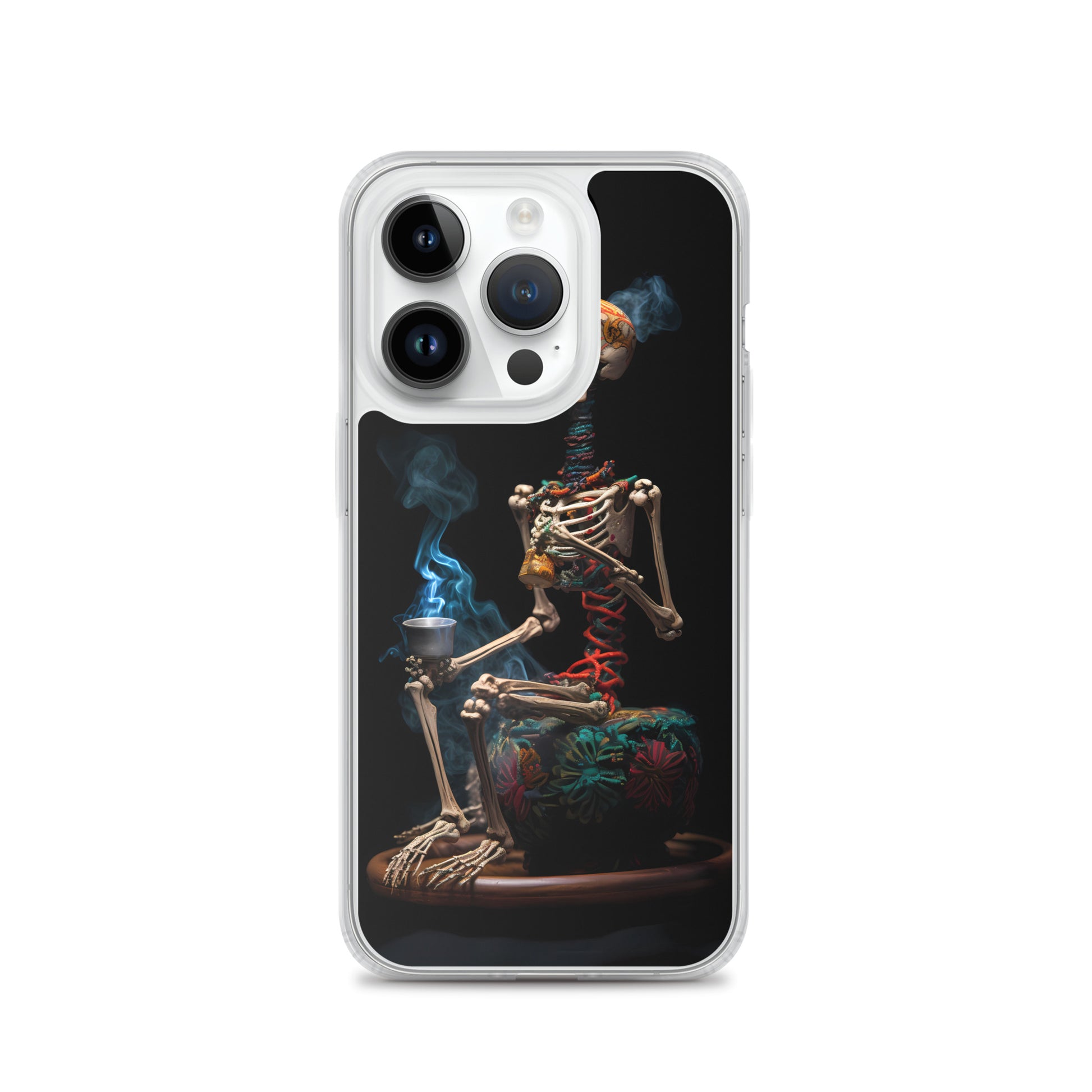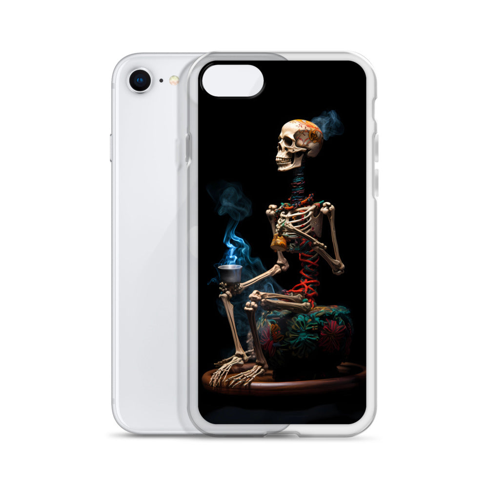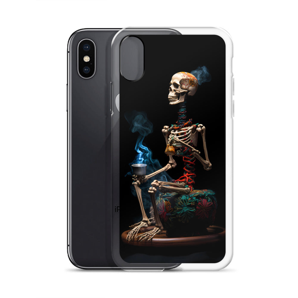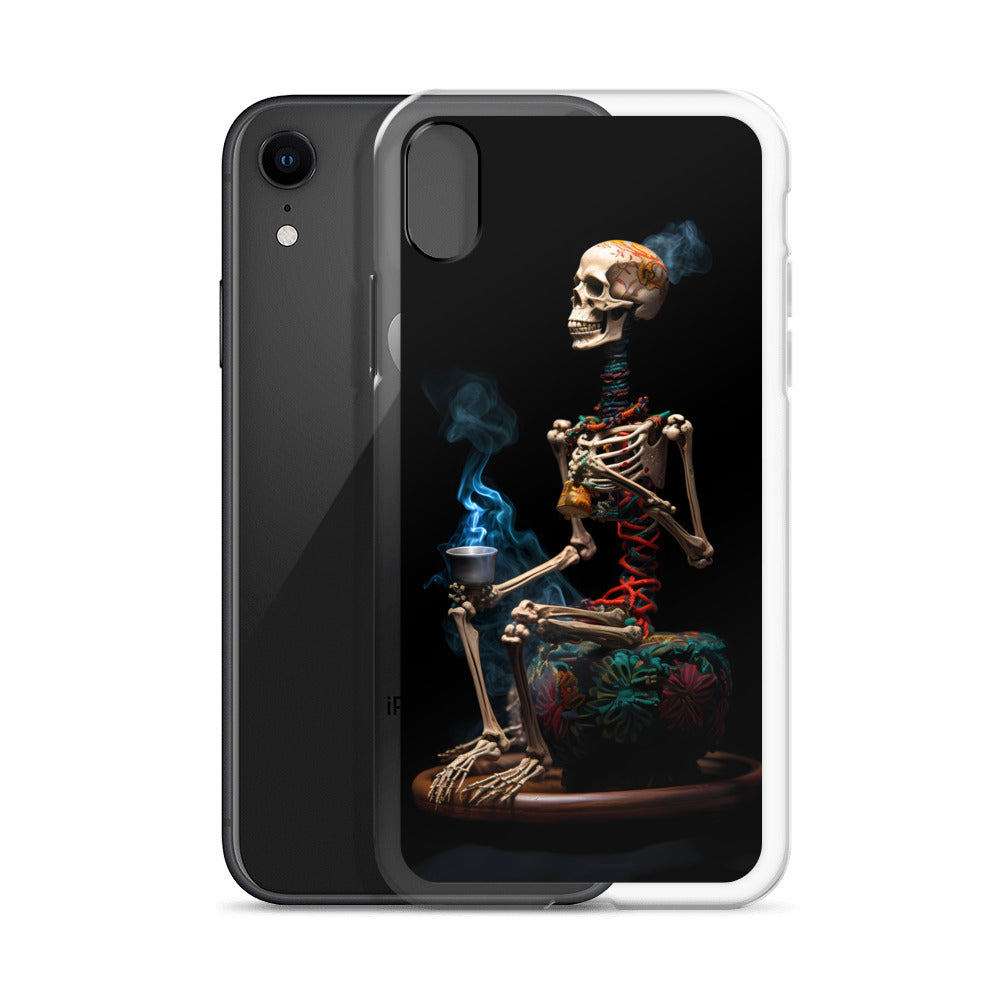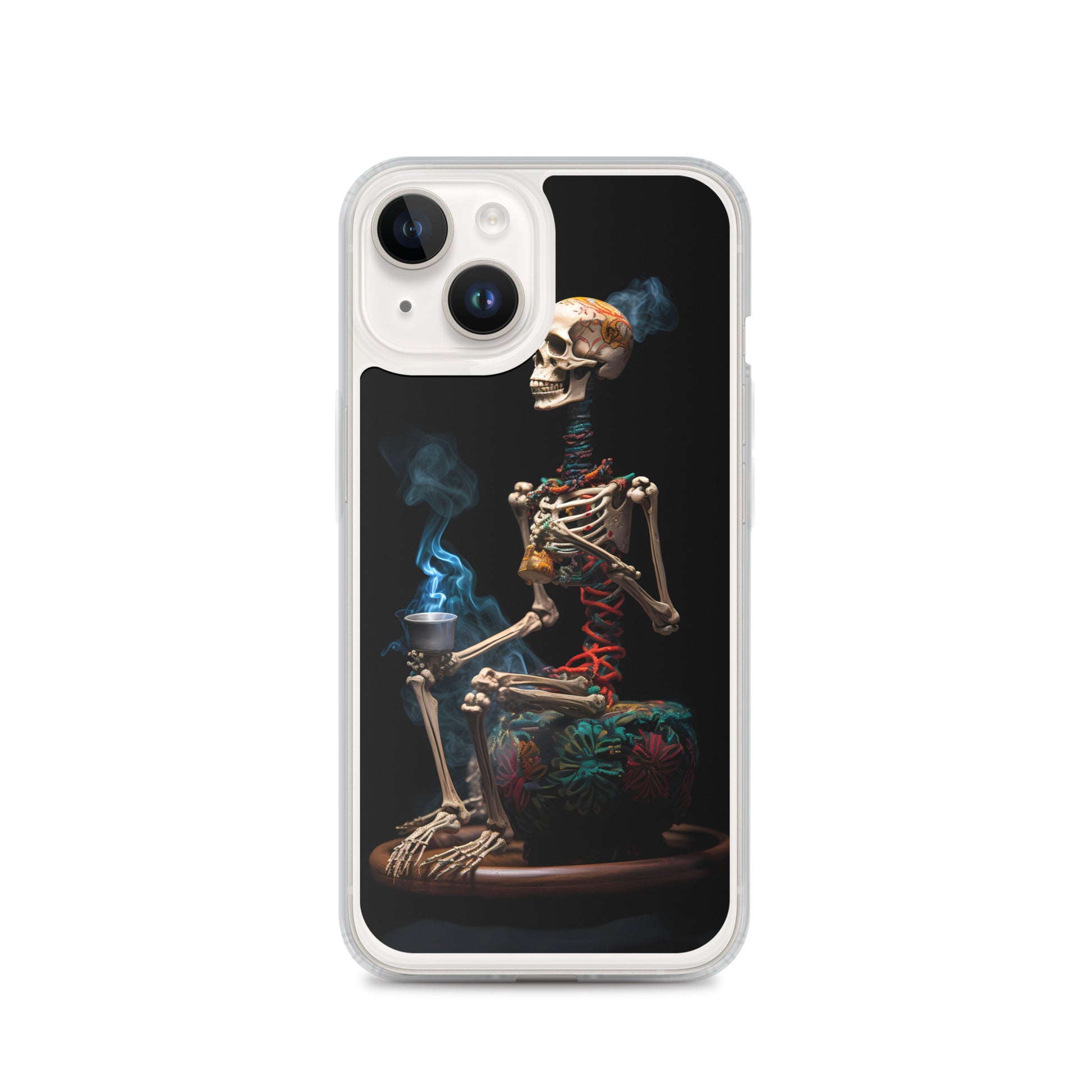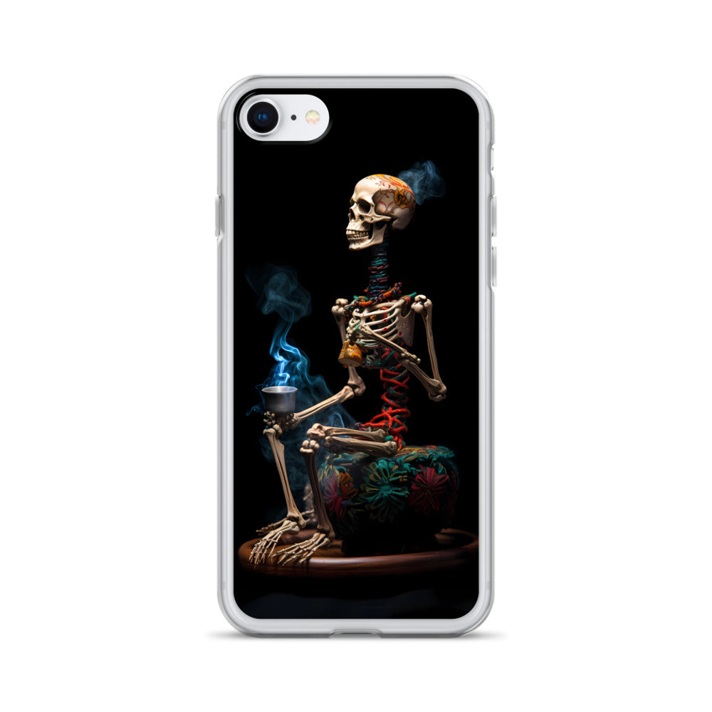 Elevate your phone style with the "Dream Smoke" Seated Skeleton iPhone Case. Inspired by hazy, dreamlike qualities, this case features a meticulously detailed still life of a skeleton sitting and smoking a cigarette. The dark humor graphic prints and symbolic props add a unique touch to the surrealist and colorful design, making it a conversation starter wherever you go.