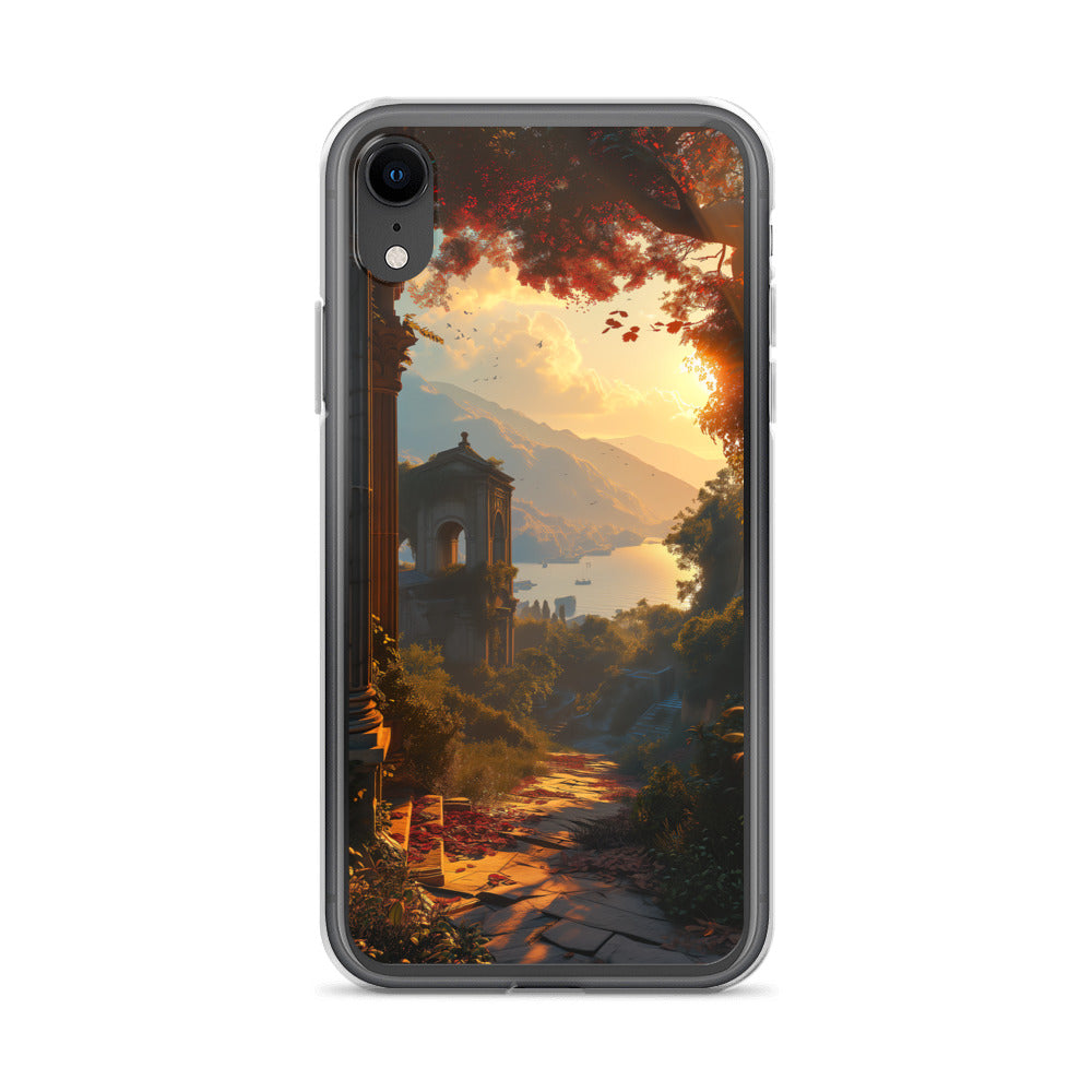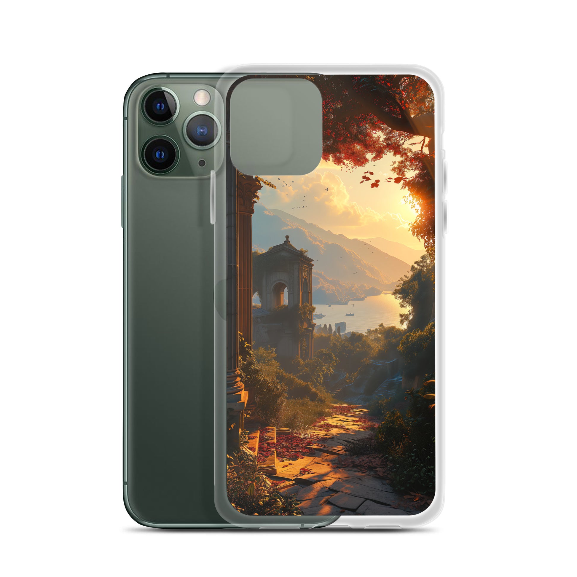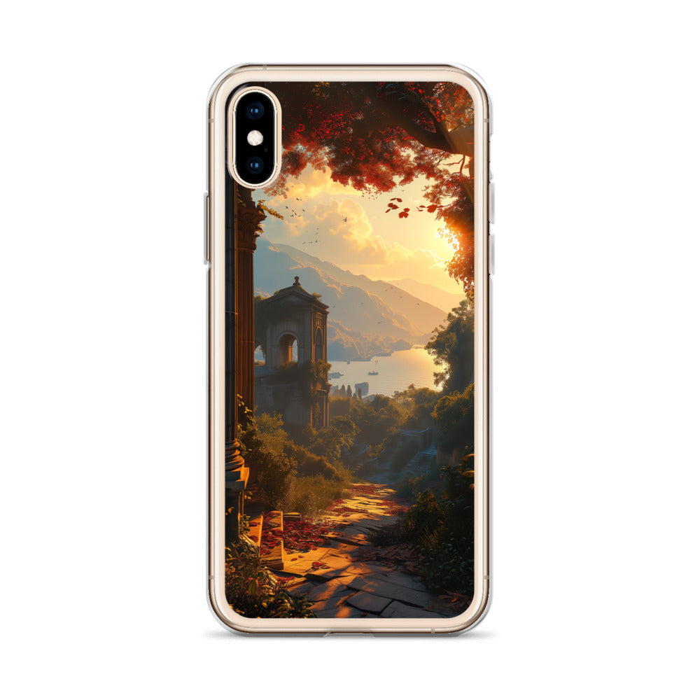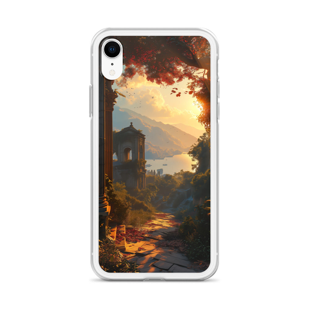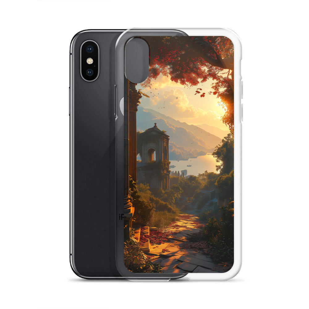 Sunset Over Sanctuary is an evocative design that portrays the tranquil beauty of an ancient temple at golden hour. The soft sun rays cascade through the foliage and classical architecture, highlighting the path to the sea beyond. This stunning piece captures the romance of old-world charm blended with the serene majesty of nature, making it a sublime addition to any collection. It's perfect for those who appreciate the spiritual beauty and the peaceful ambiance of sunset landscapes.