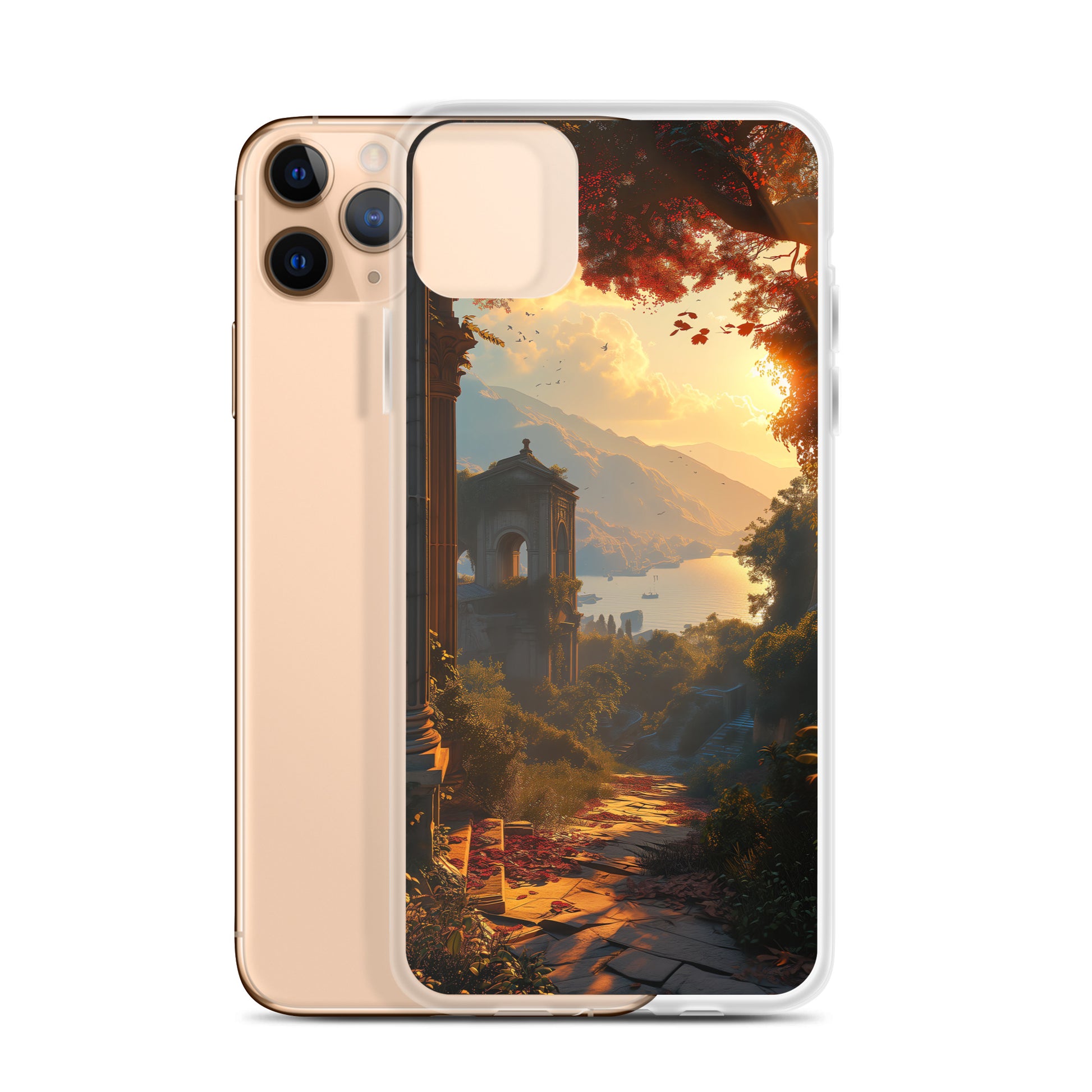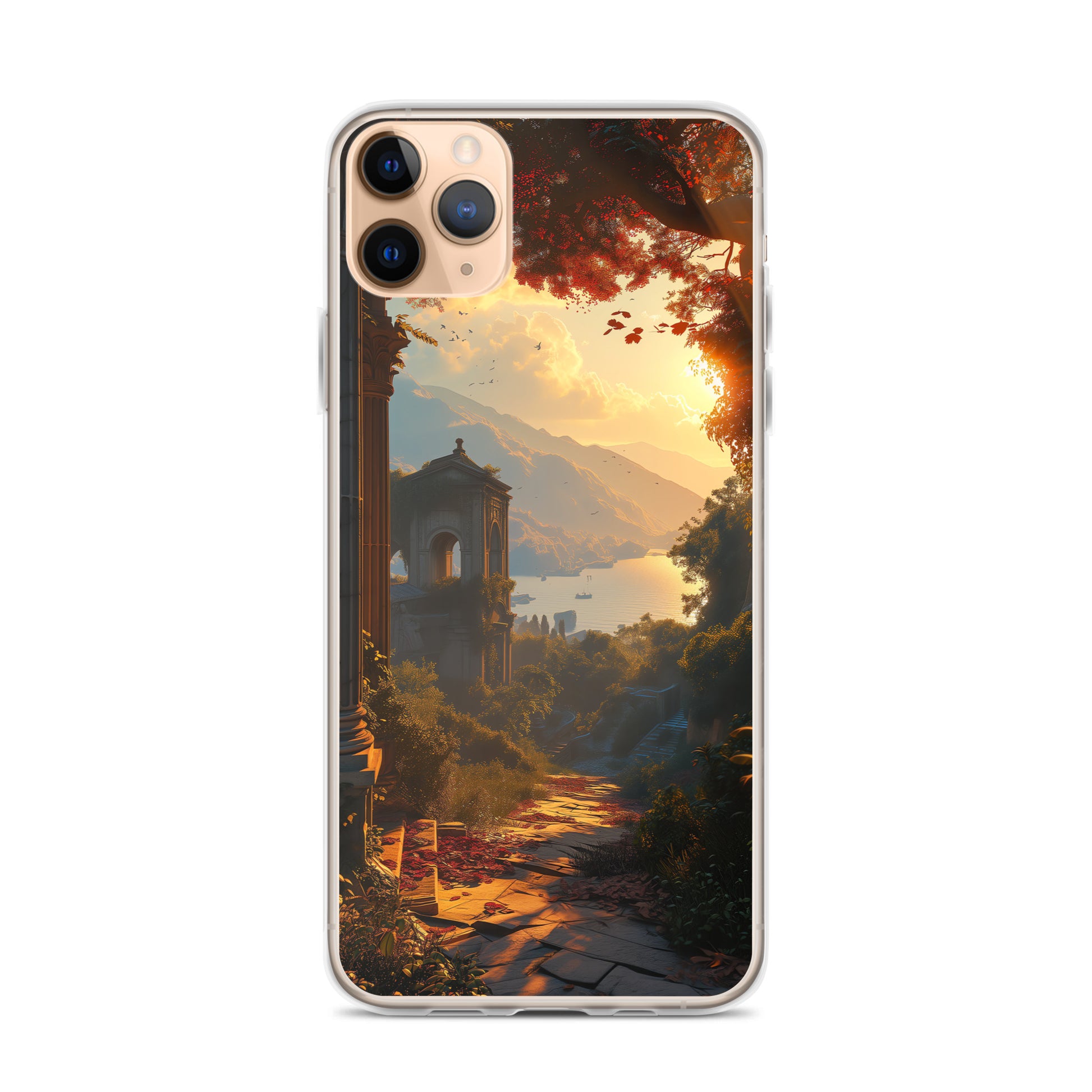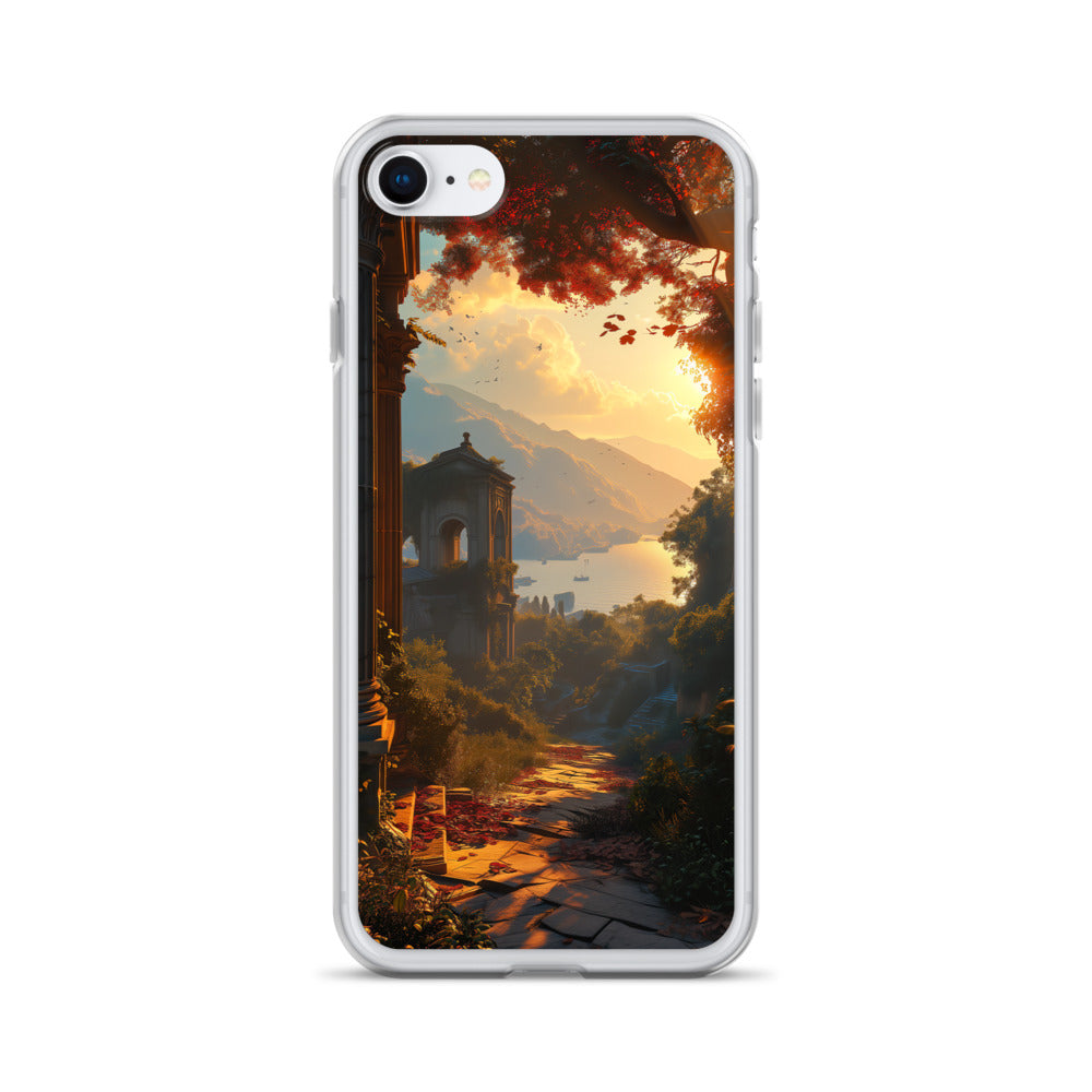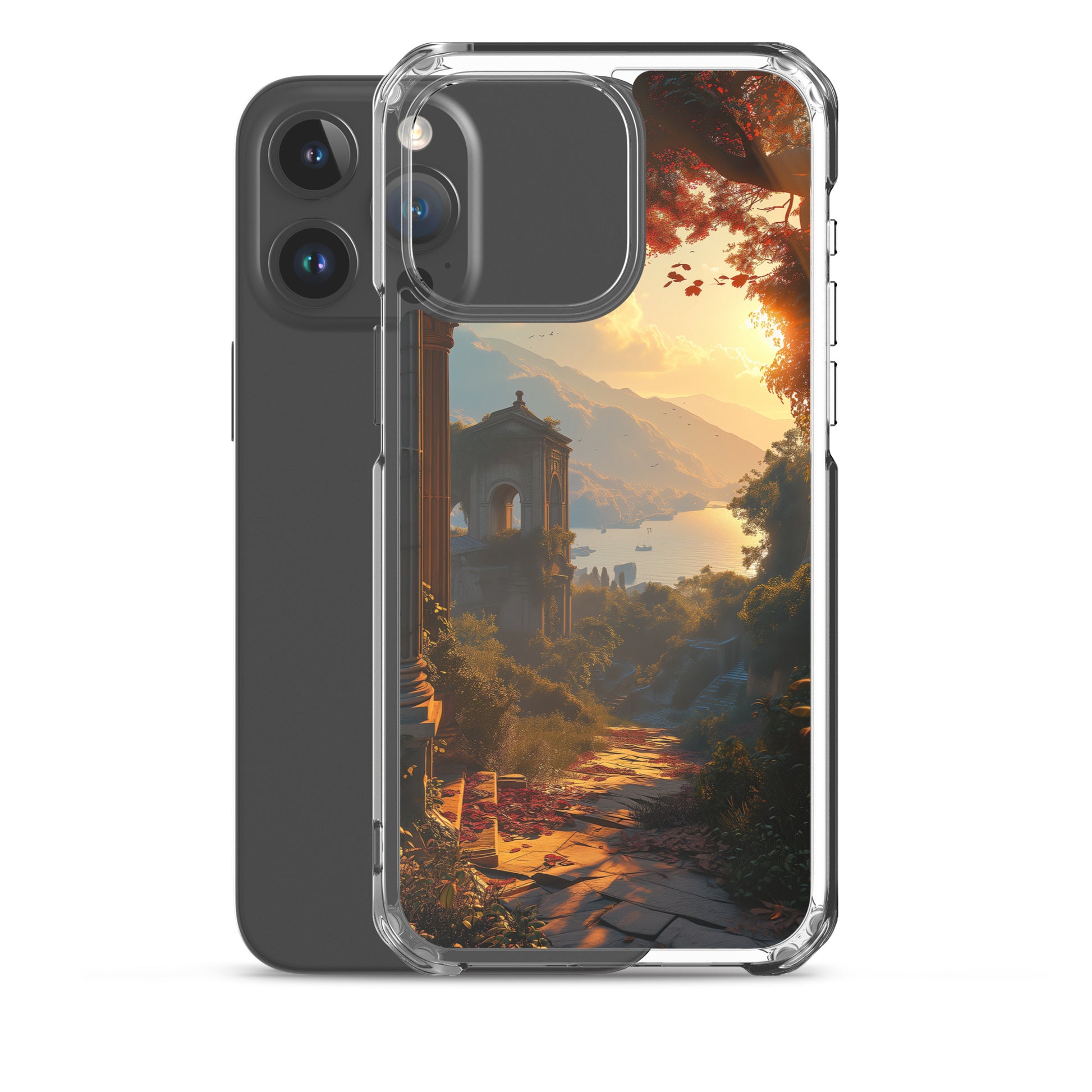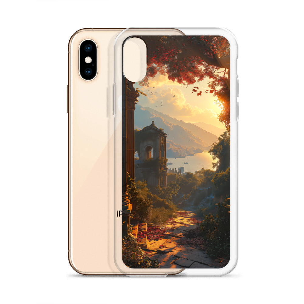 Sunset Over Sanctuary is an evocative design that portrays the tranquil beauty of an ancient temple at golden hour. The soft sun rays cascade through the foliage and classical architecture, highlighting the path to the sea beyond. This stunning piece captures the romance of old-world charm blended with the serene majesty of nature, making it a sublime addition to any collection. It's perfect for those who appreciate the spiritual beauty and the peaceful ambiance of sunset landscapes.