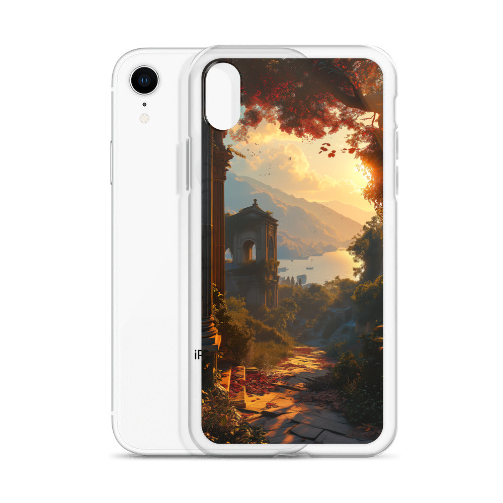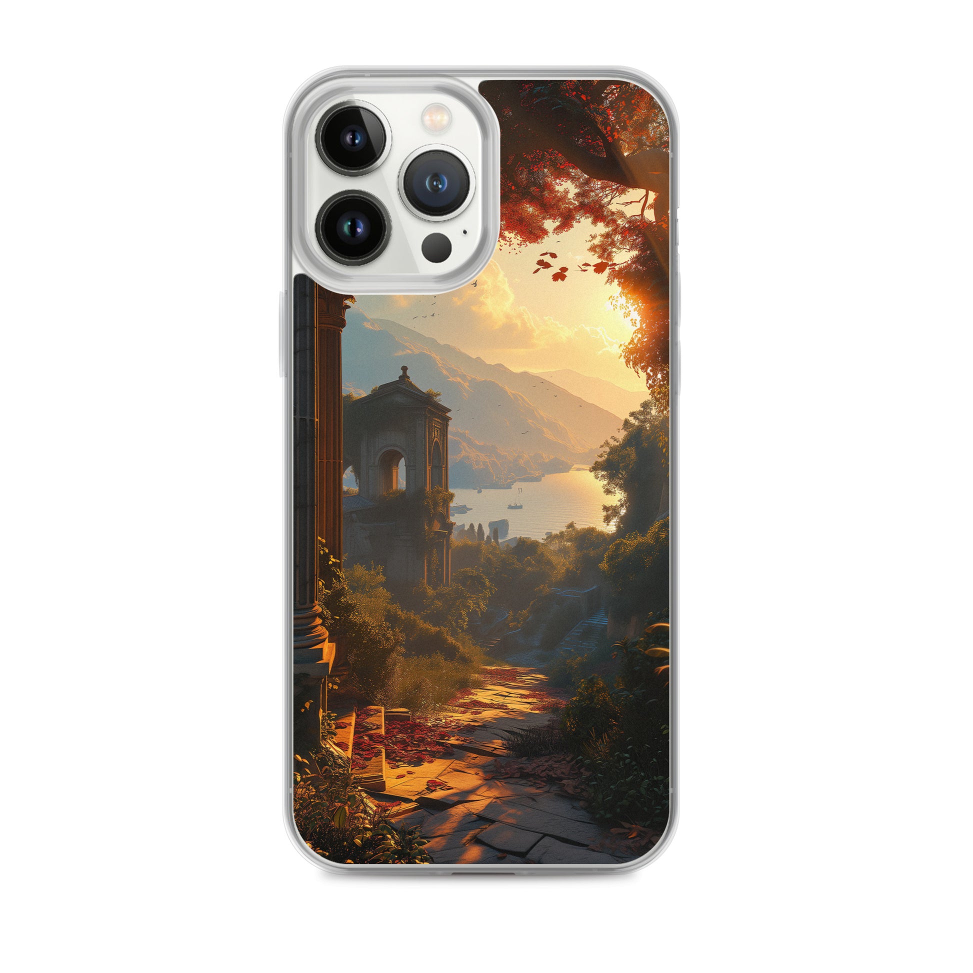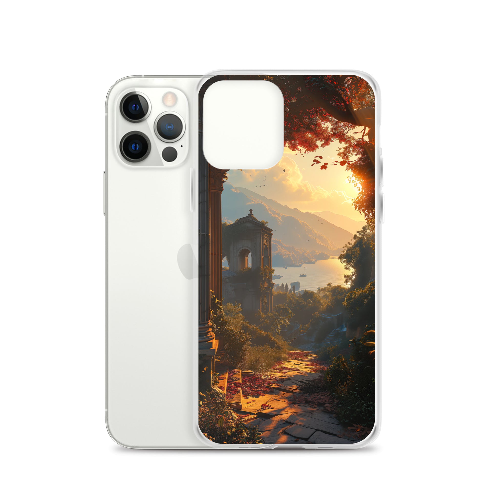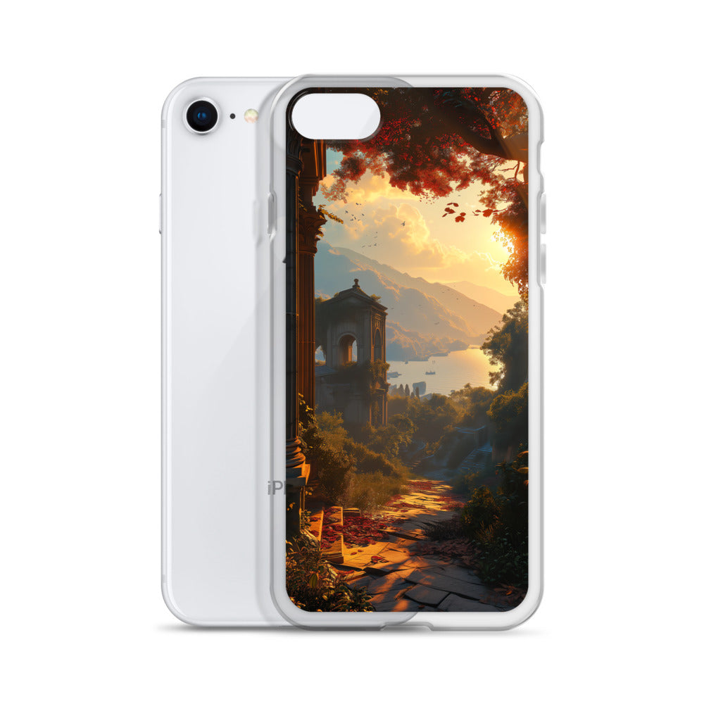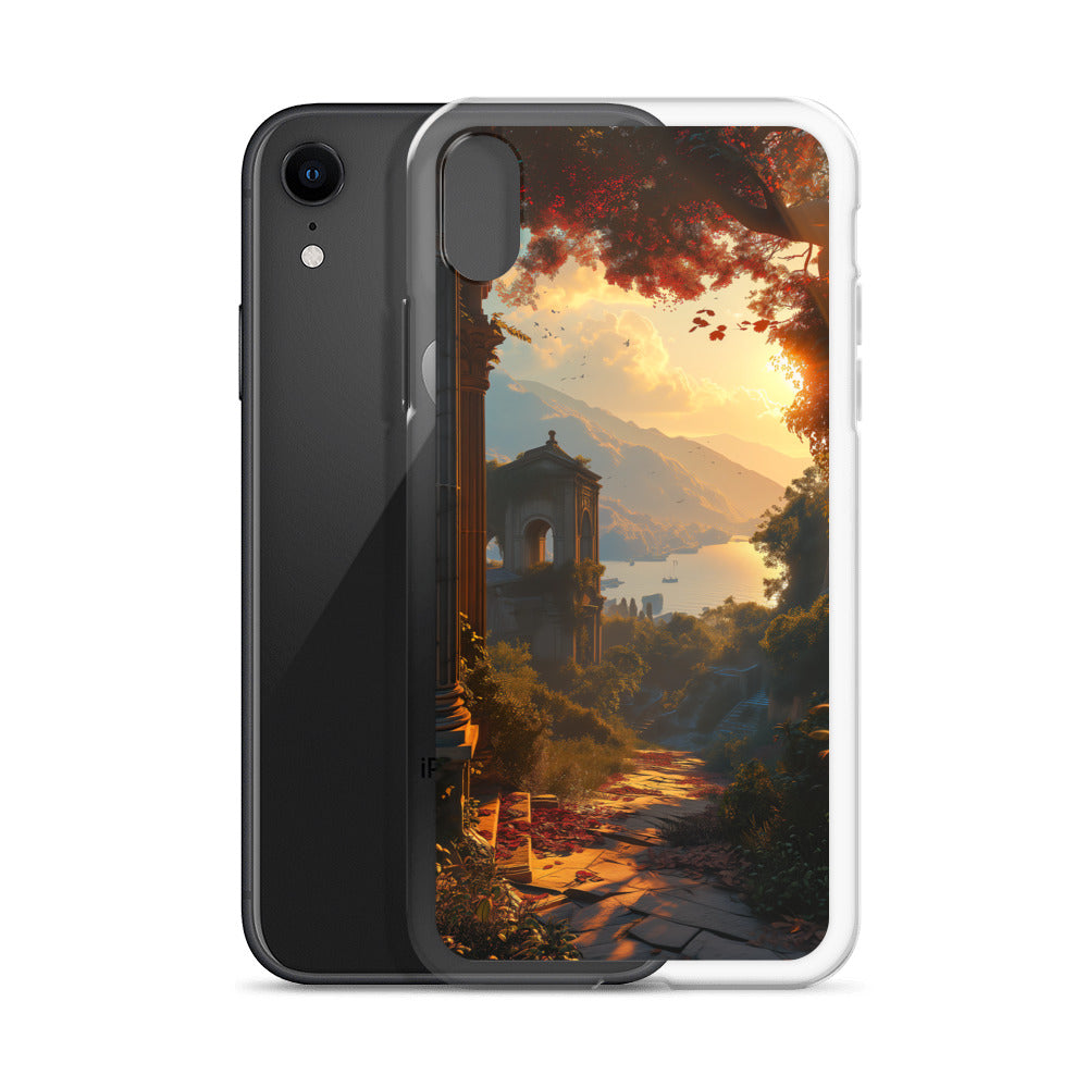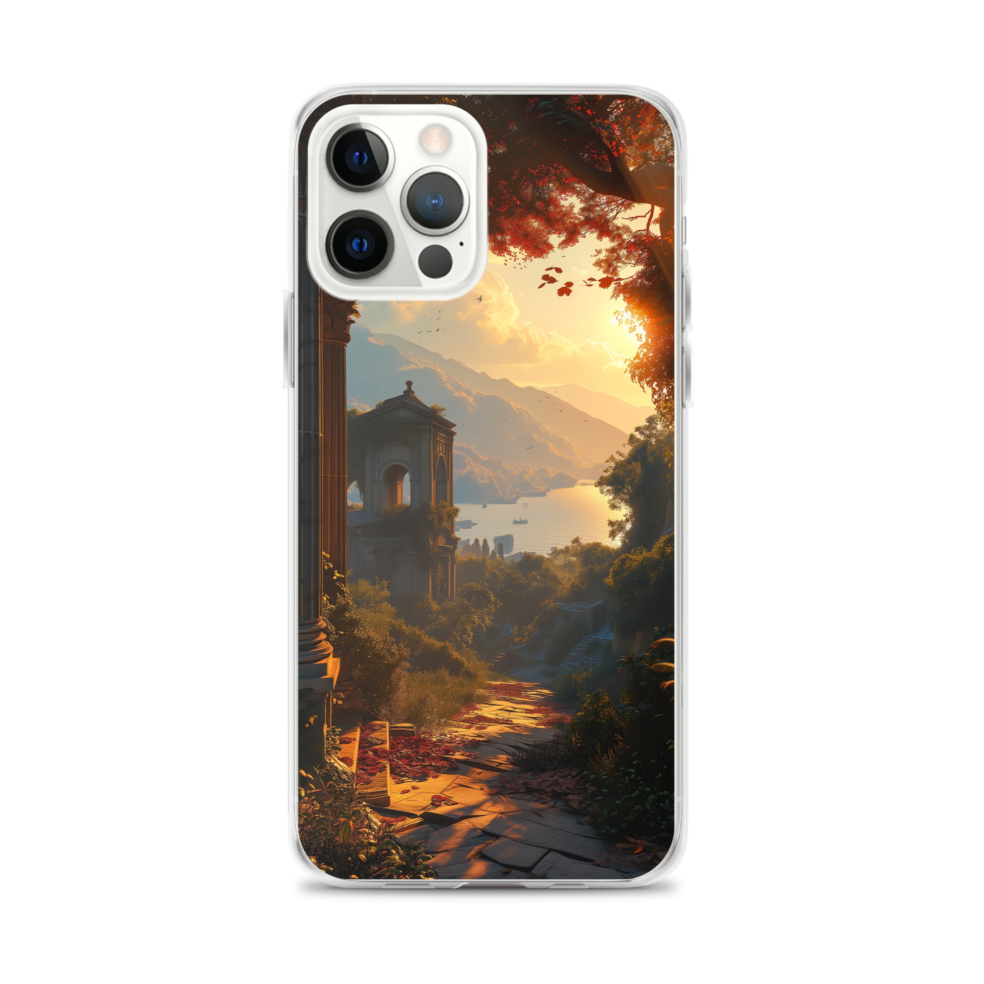 Sunset Over Sanctuary is an evocative design that portrays the tranquil beauty of an ancient temple at golden hour. The soft sun rays cascade through the foliage and classical architecture, highlighting the path to the sea beyond. This stunning piece captures the romance of old-world charm blended with the serene majesty of nature, making it a sublime addition to any collection. It's perfect for those who appreciate the spiritual beauty and the peaceful ambiance of sunset landscapes.