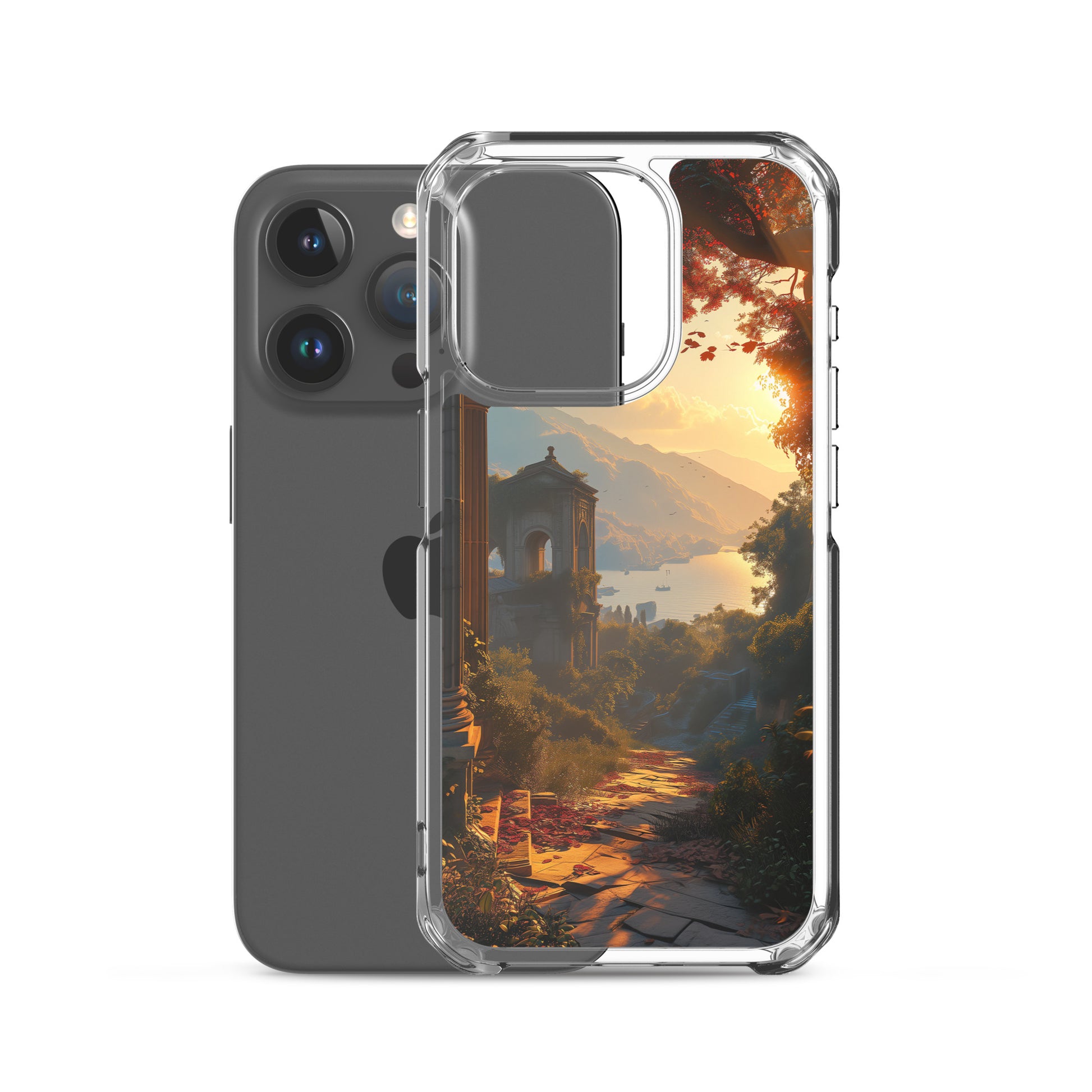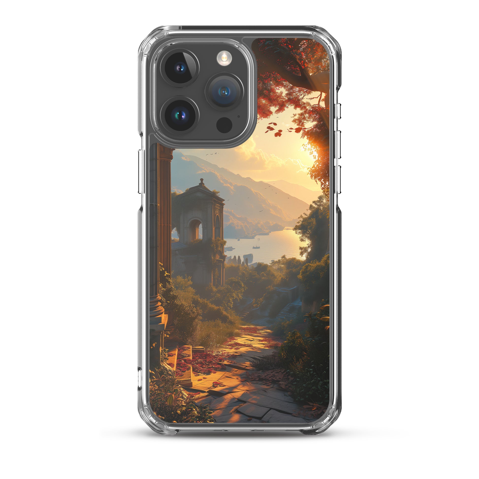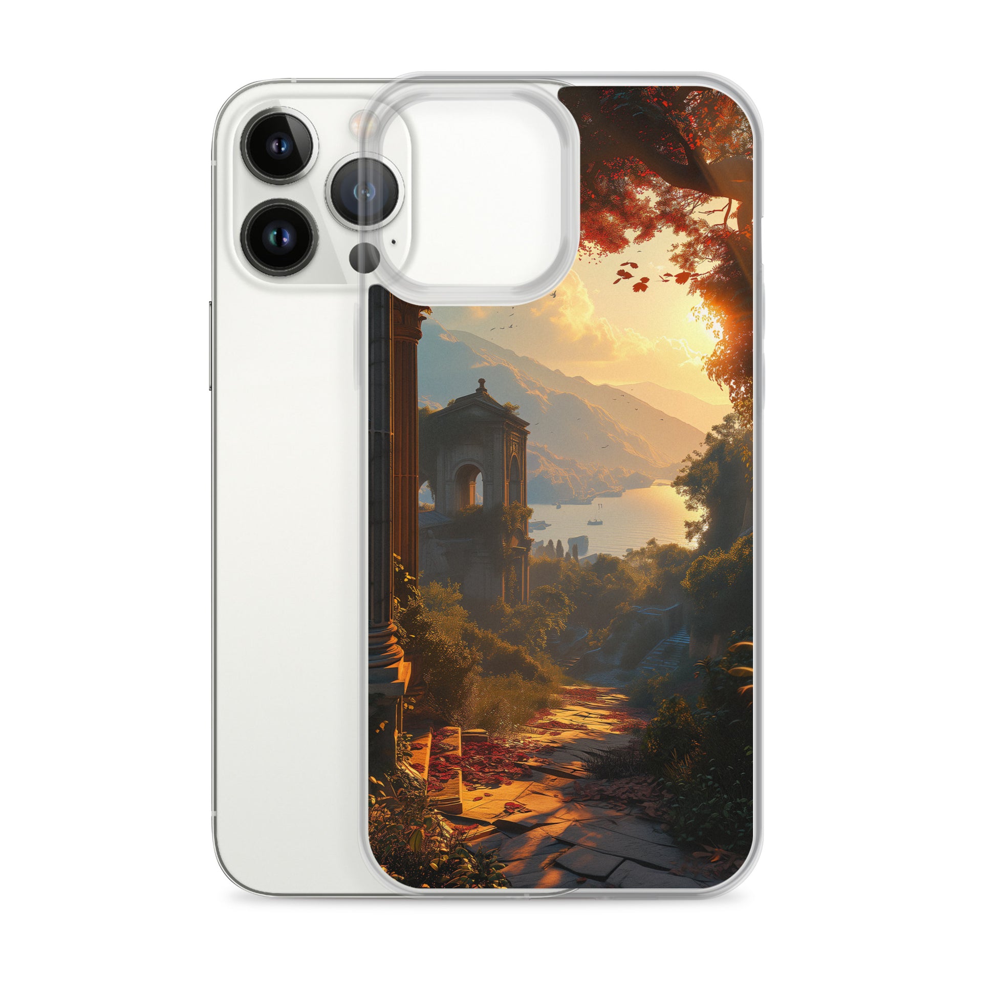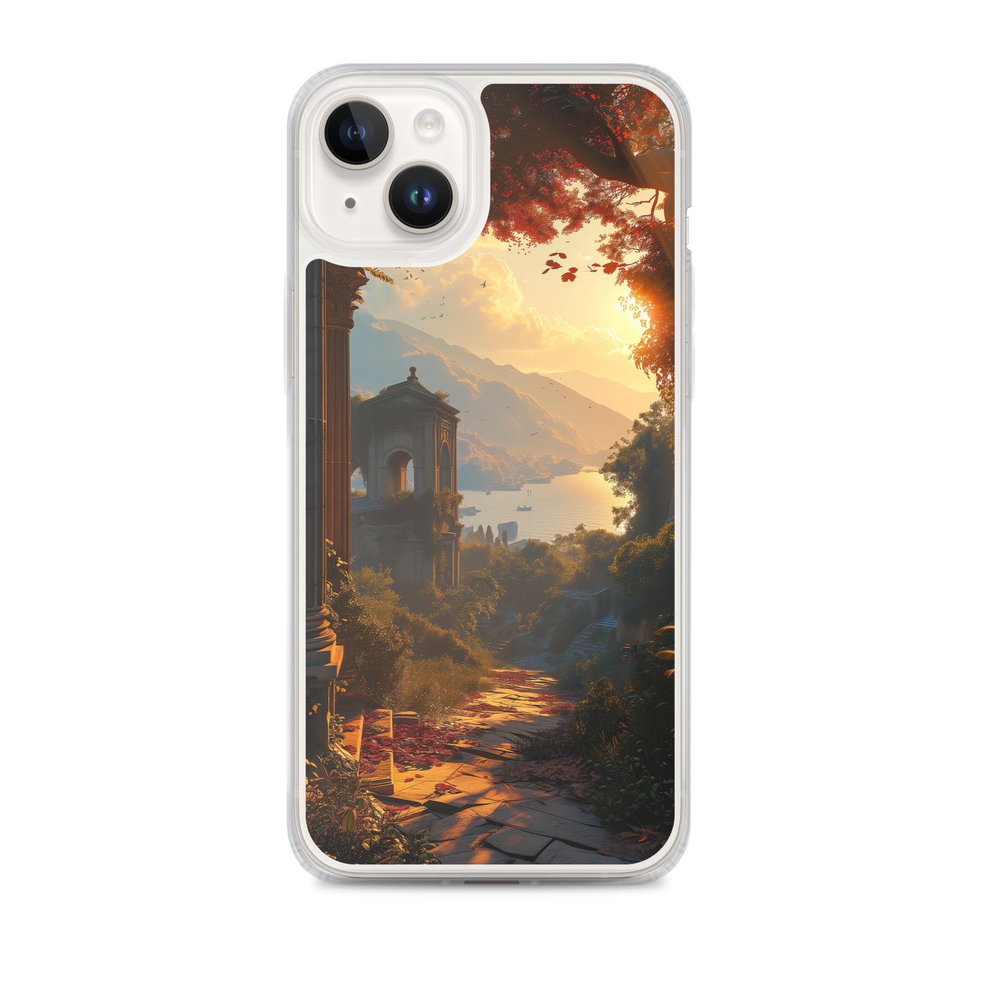 Sunset Over Sanctuary is an evocative design that portrays the tranquil beauty of an ancient temple at golden hour. The soft sun rays cascade through the foliage and classical architecture, highlighting the path to the sea beyond. This stunning piece captures the romance of old-world charm blended with the serene majesty of nature, making it a sublime addition to any collection. It's perfect for those who appreciate the spiritual beauty and the peaceful ambiance of sunset landscapes.