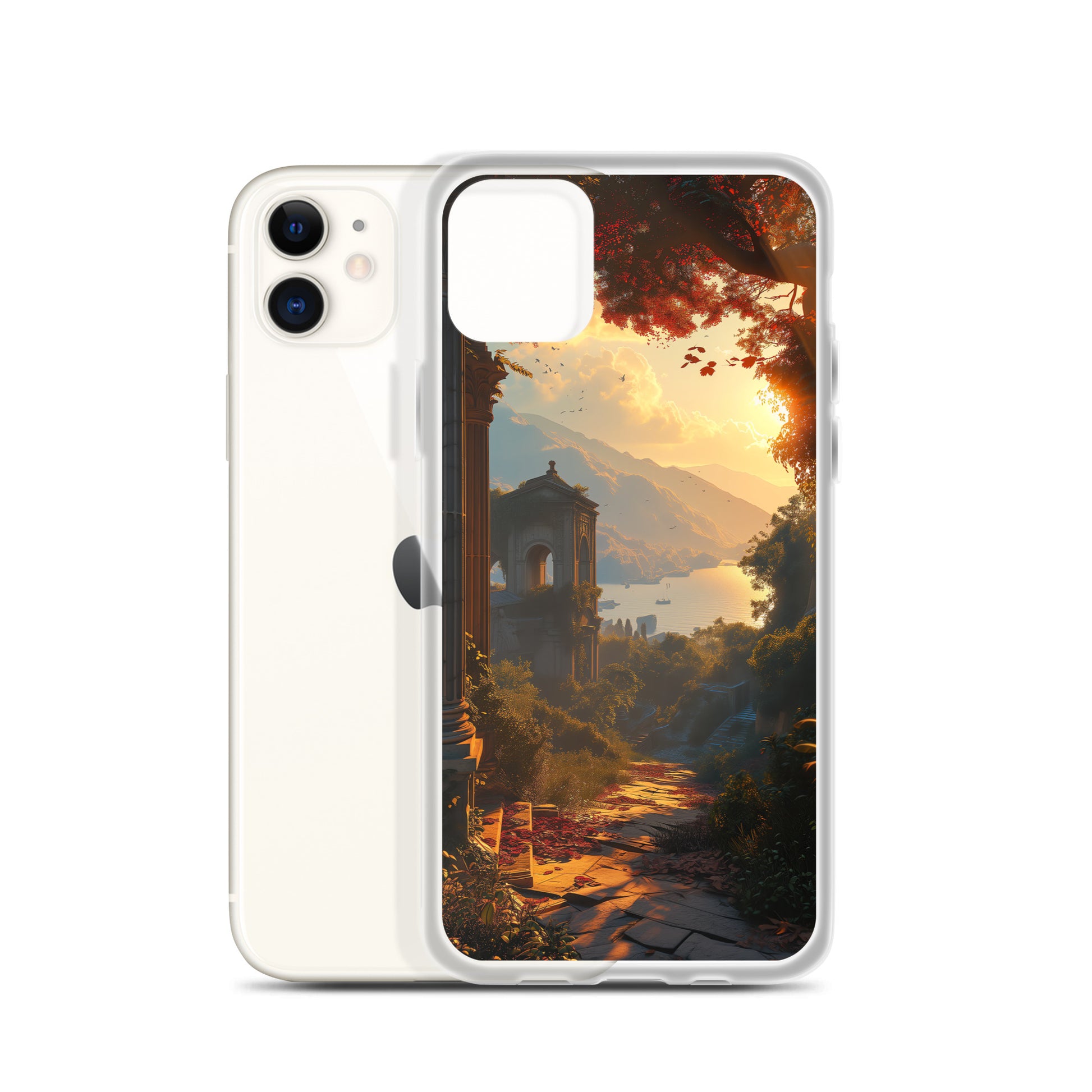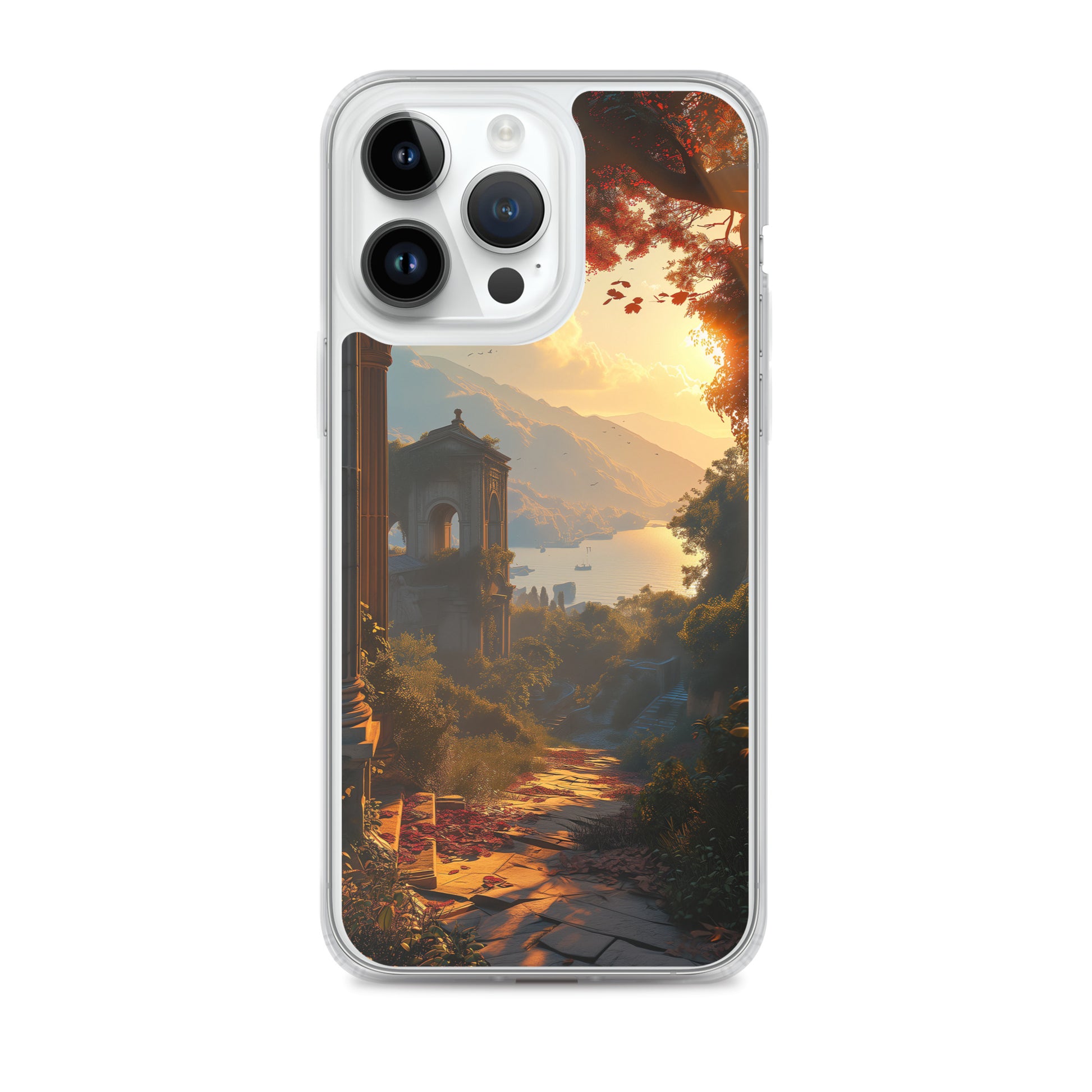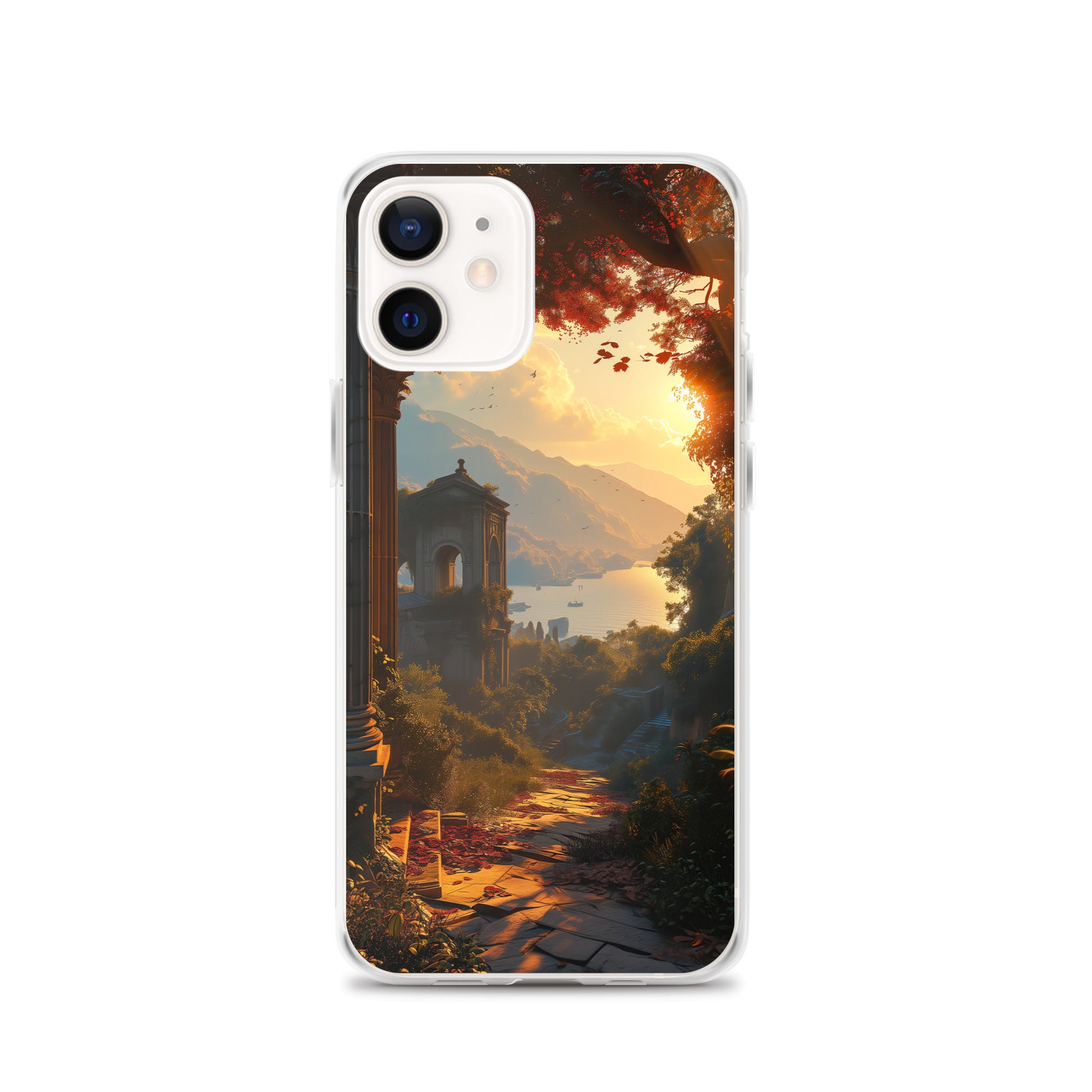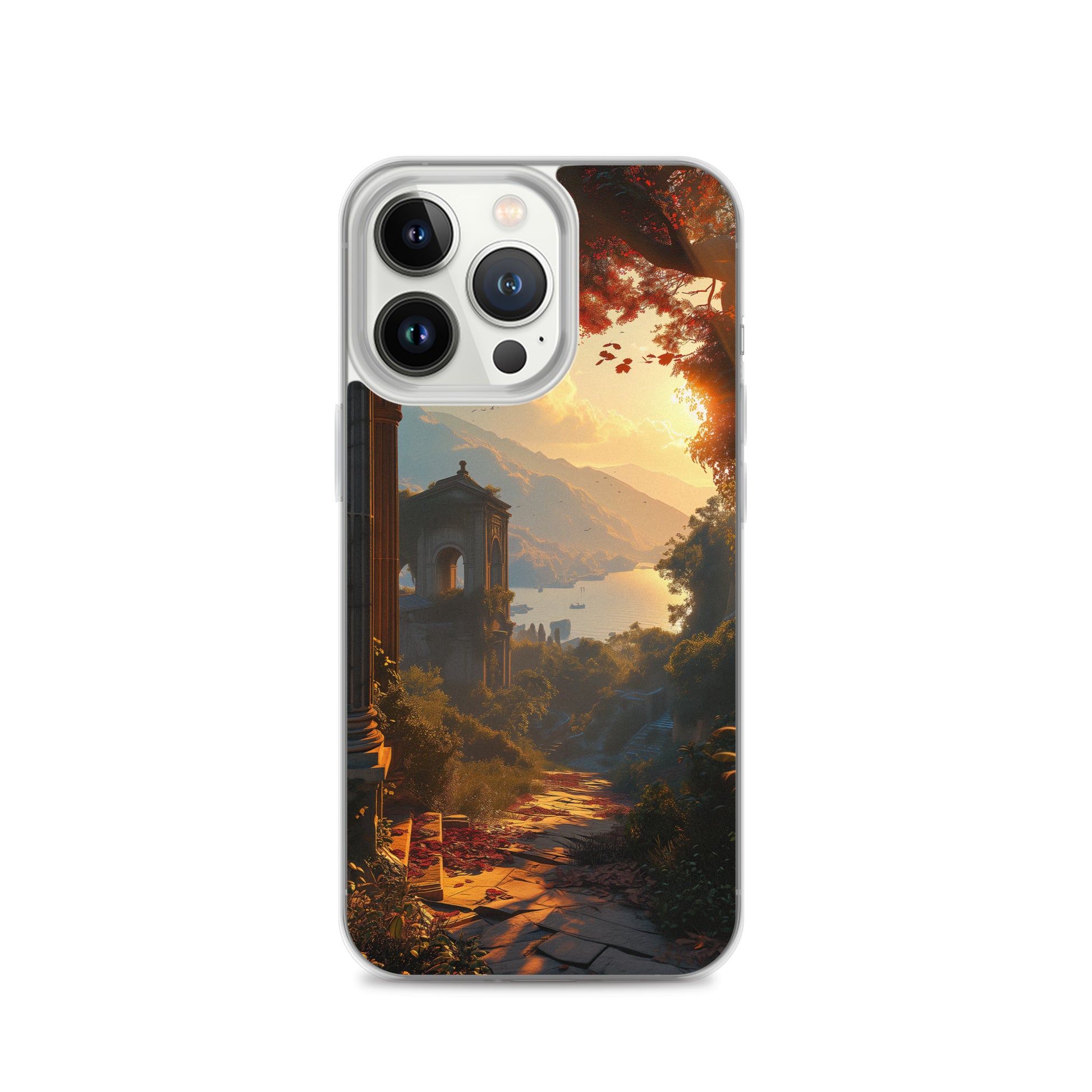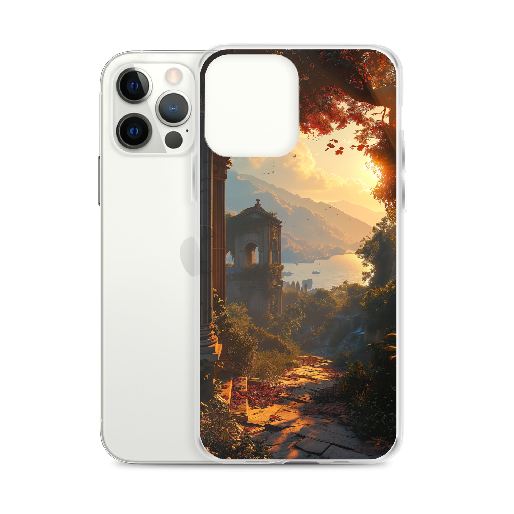 Sunset Over Sanctuary is an evocative design that portrays the tranquil beauty of an ancient temple at golden hour. The soft sun rays cascade through the foliage and classical architecture, highlighting the path to the sea beyond. This stunning piece captures the romance of old-world charm blended with the serene majesty of nature, making it a sublime addition to any collection. It's perfect for those who appreciate the spiritual beauty and the peaceful ambiance of sunset landscapes.