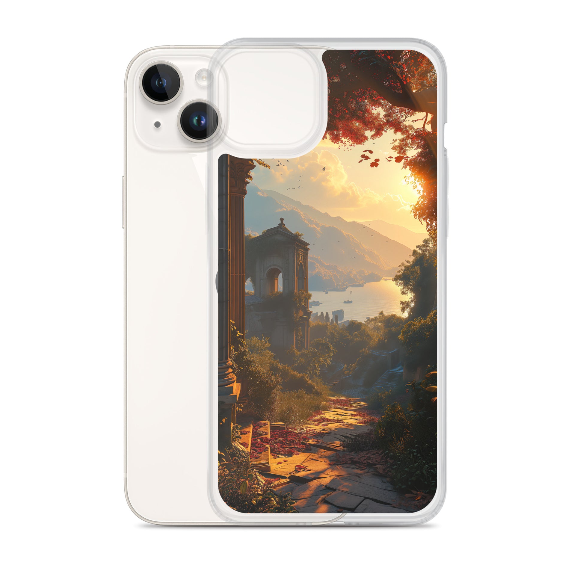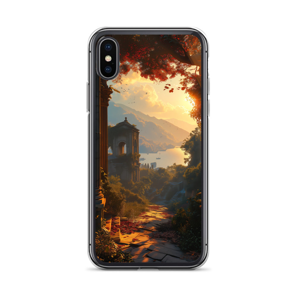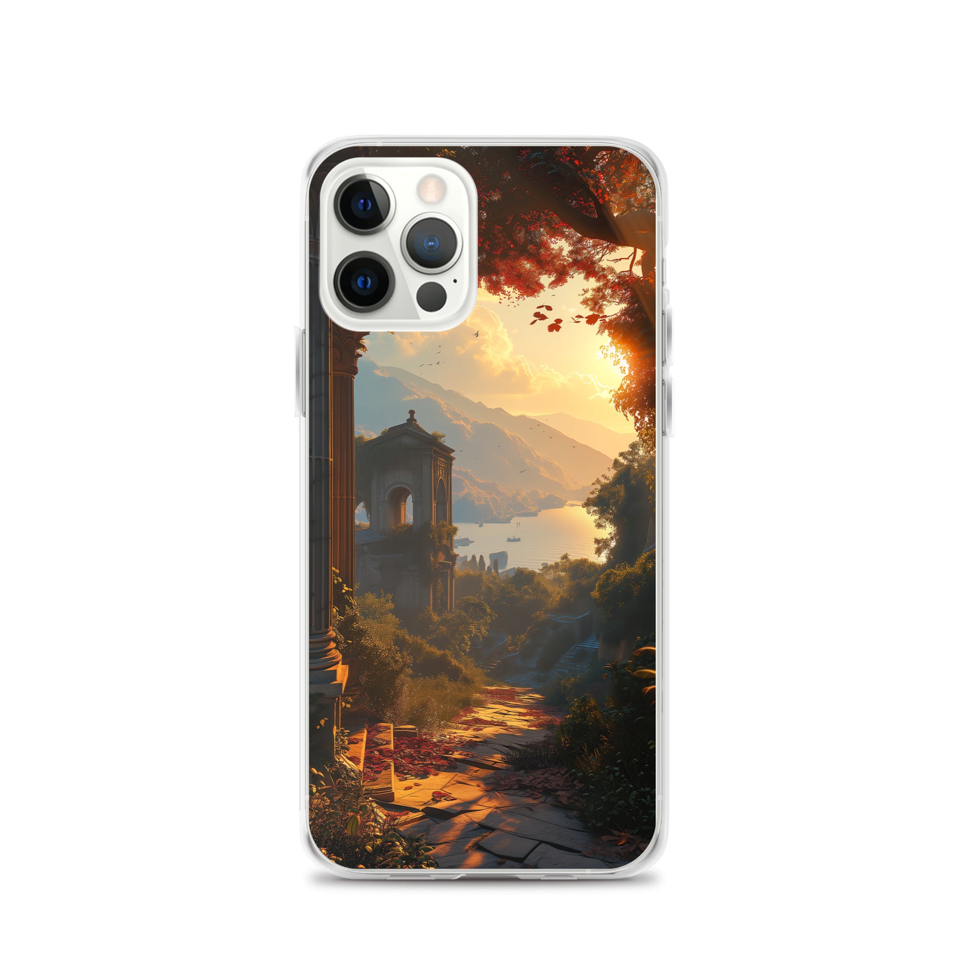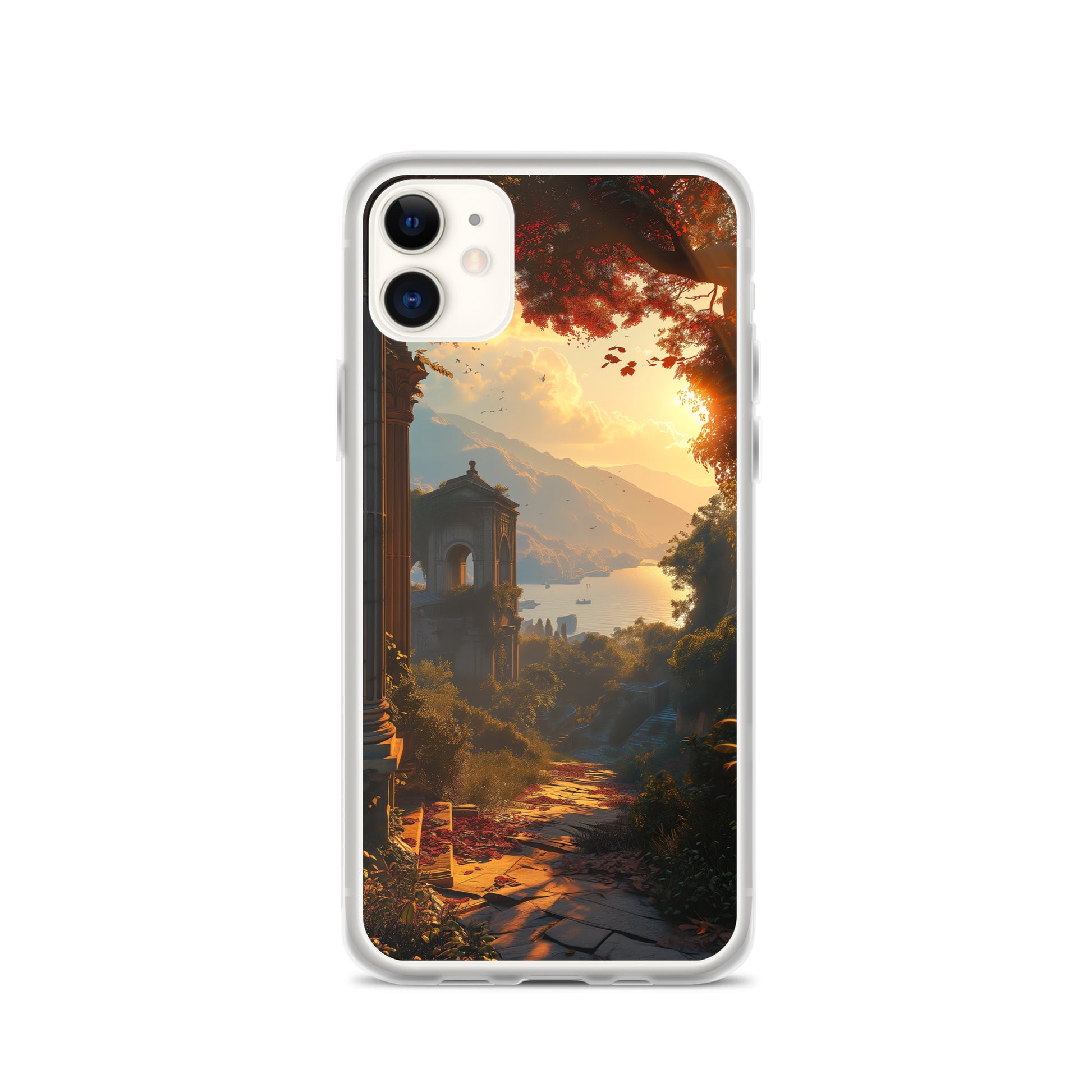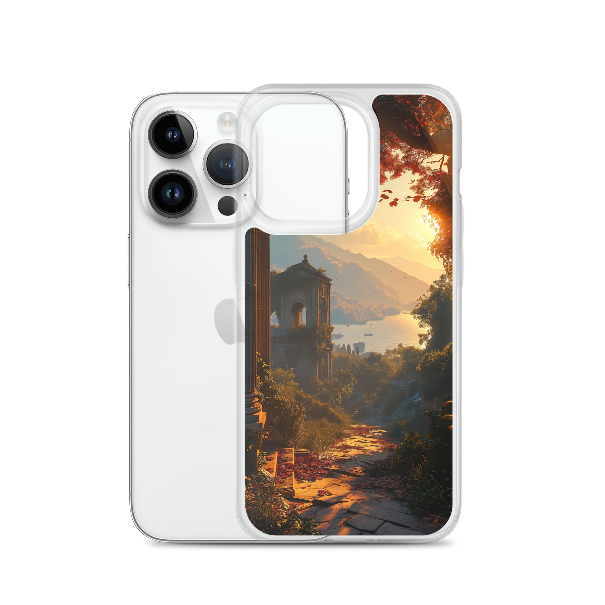 Sunset Over Sanctuary is an evocative design that portrays the tranquil beauty of an ancient temple at golden hour. The soft sun rays cascade through the foliage and classical architecture, highlighting the path to the sea beyond. This stunning piece captures the romance of old-world charm blended with the serene majesty of nature, making it a sublime addition to any collection. It's perfect for those who appreciate the spiritual beauty and the peaceful ambiance of sunset landscapes.