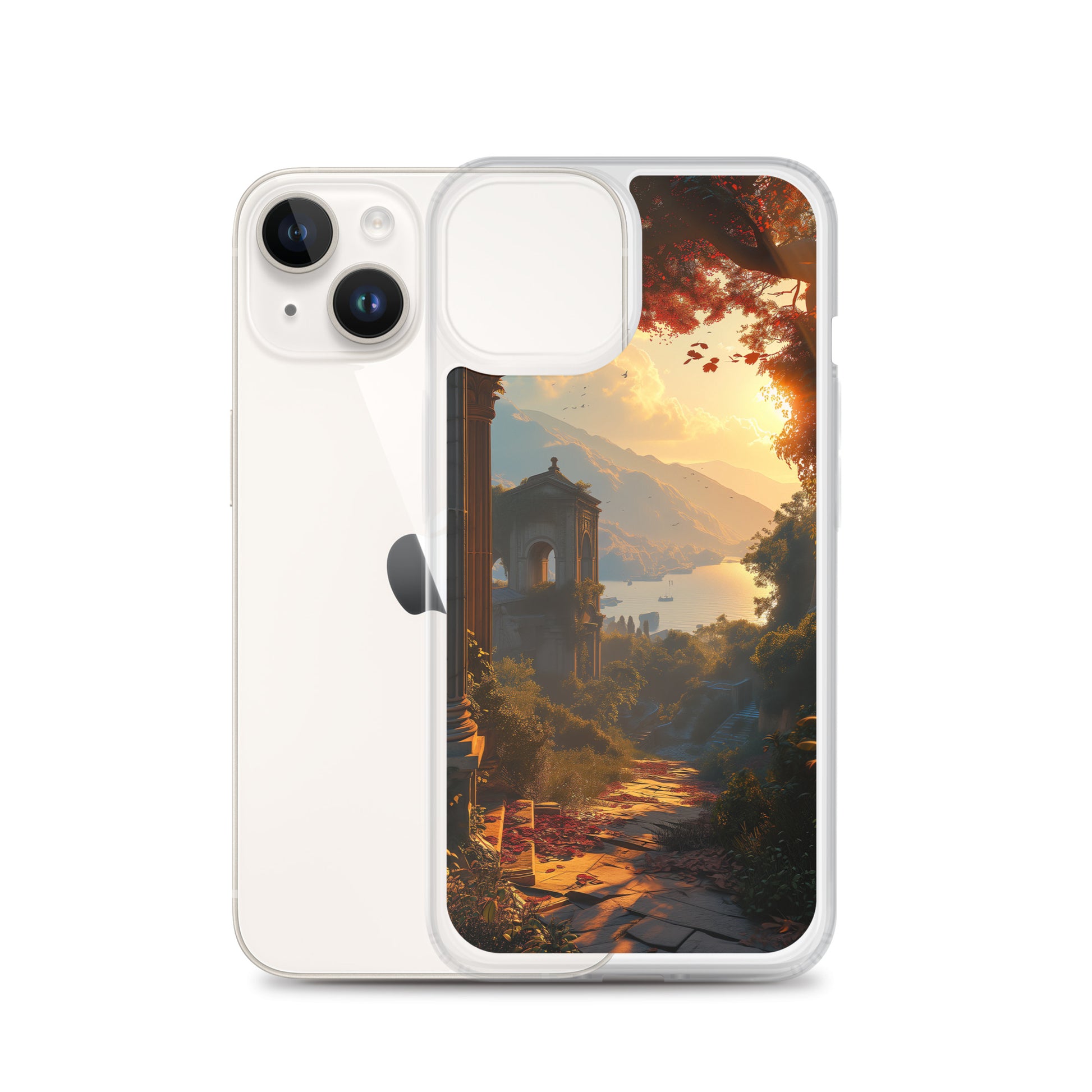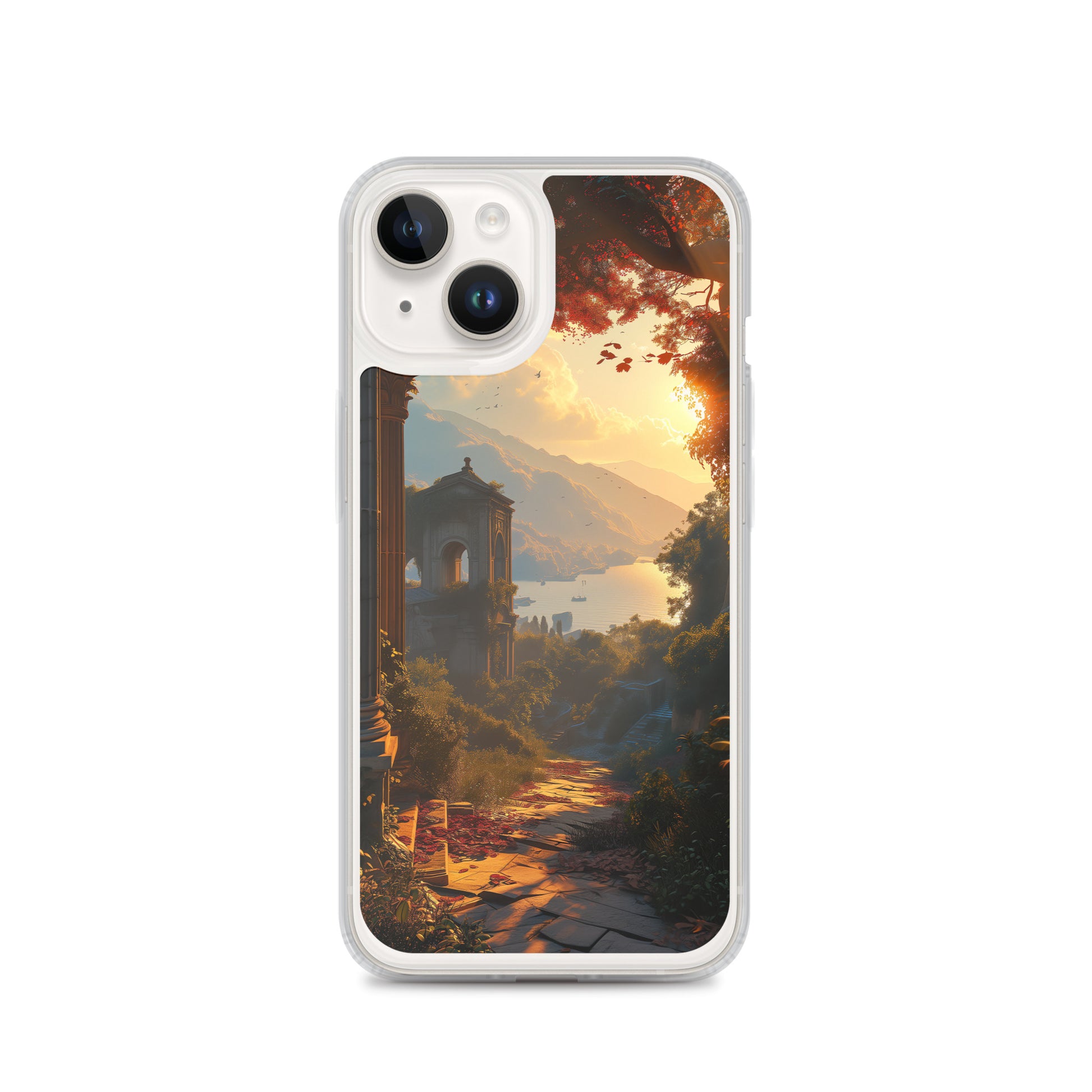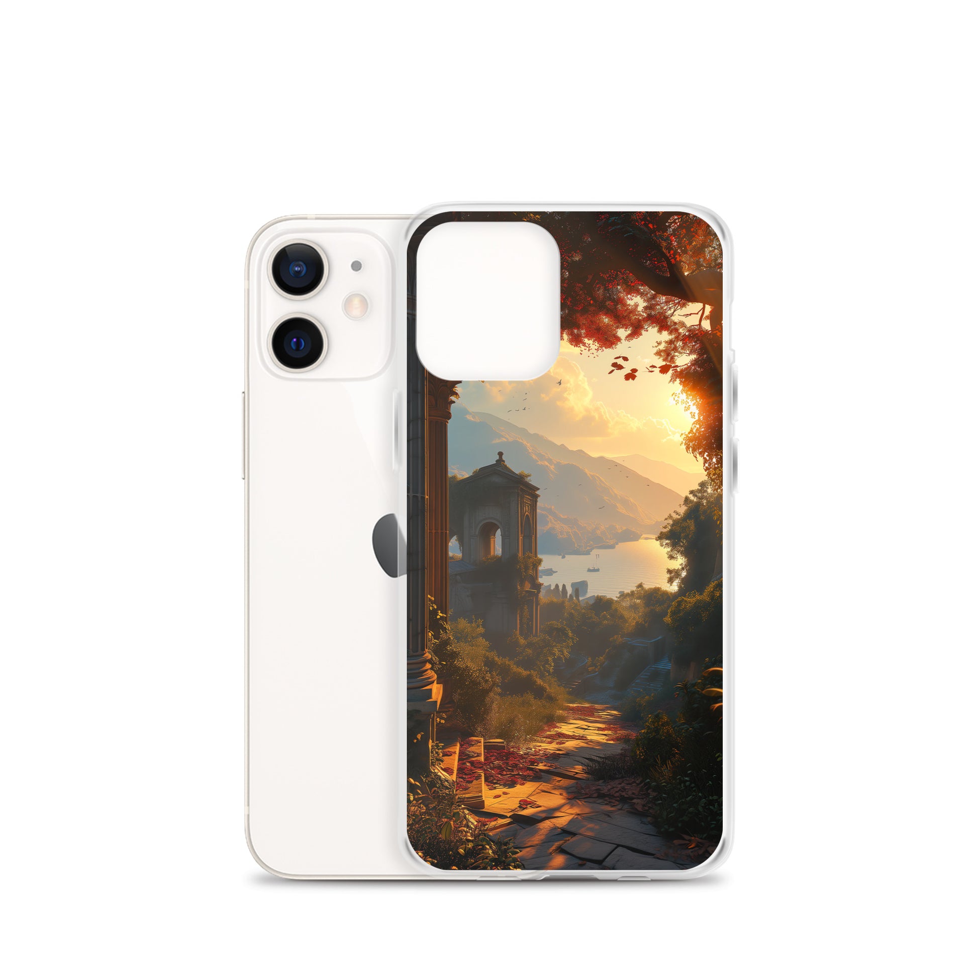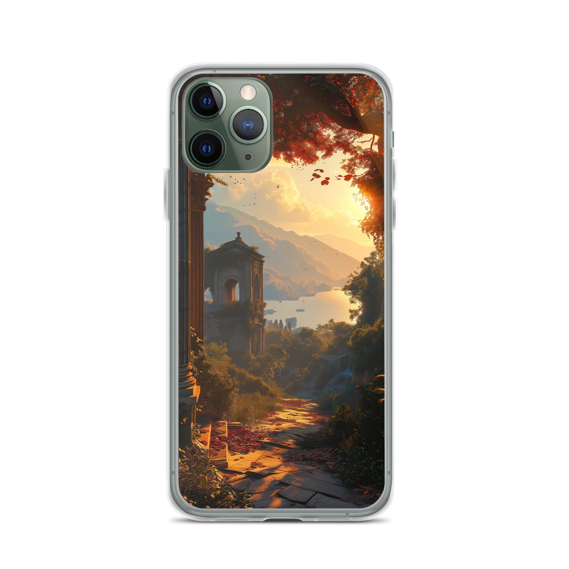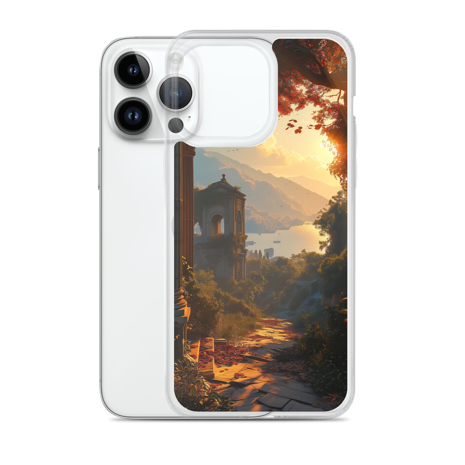 Sunset Over Sanctuary is an evocative design that portrays the tranquil beauty of an ancient temple at golden hour. The soft sun rays cascade through the foliage and classical architecture, highlighting the path to the sea beyond. This stunning piece captures the romance of old-world charm blended with the serene majesty of nature, making it a sublime addition to any collection. It's perfect for those who appreciate the spiritual beauty and the peaceful ambiance of sunset landscapes.