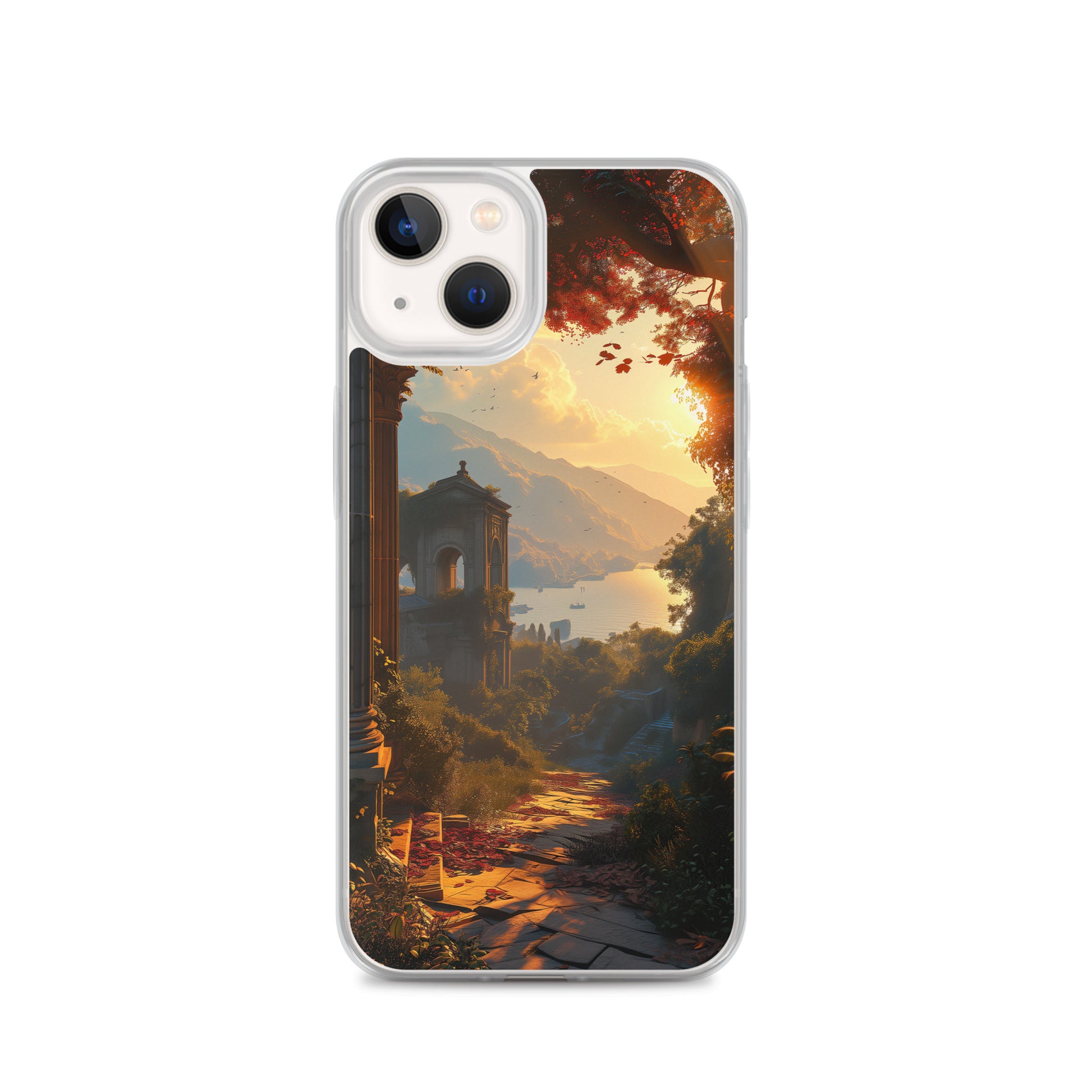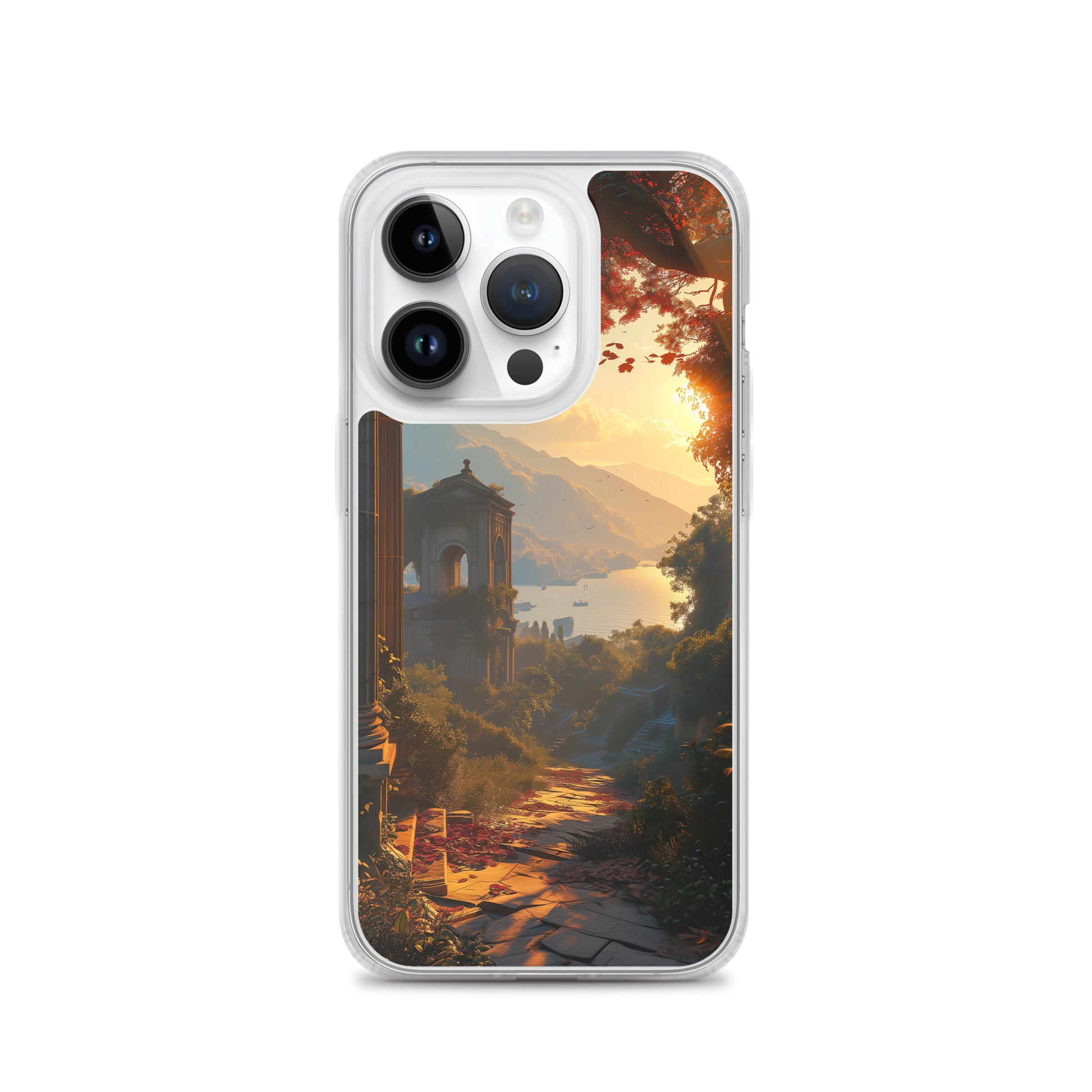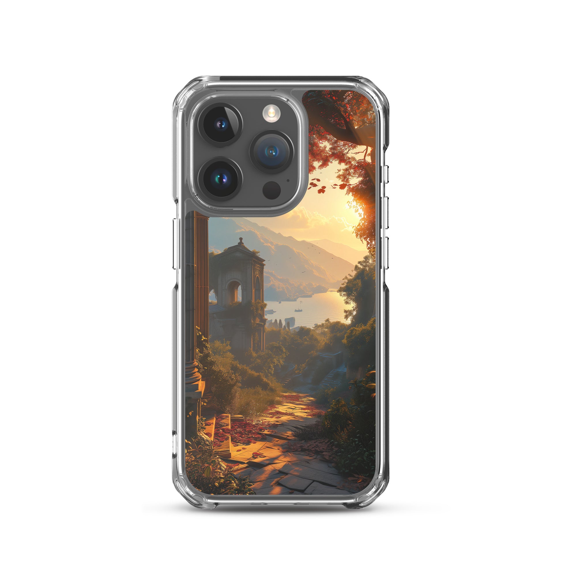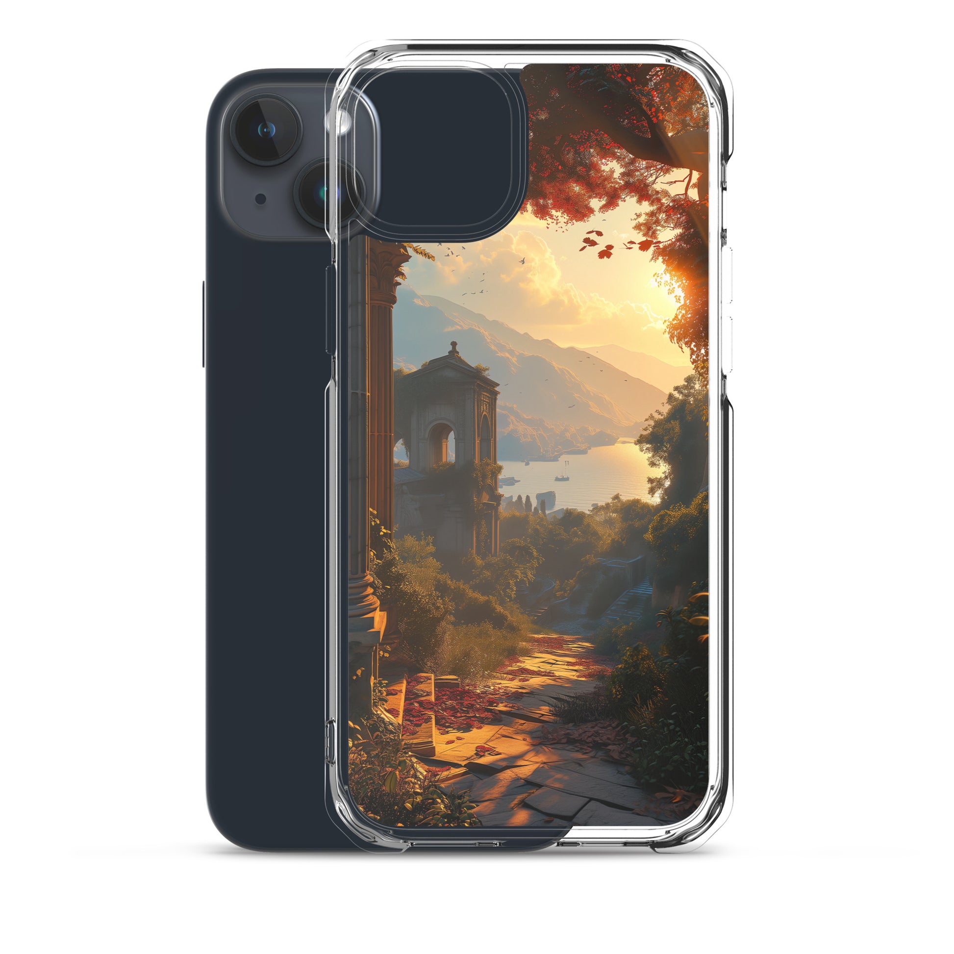 Sunset Over Sanctuary is an evocative design that portrays the tranquil beauty of an ancient temple at golden hour. The soft sun rays cascade through the foliage and classical architecture, highlighting the path to the sea beyond. This stunning piece captures the romance of old-world charm blended with the serene majesty of nature, making it a sublime addition to any collection. It's perfect for those who appreciate the spiritual beauty and the peaceful ambiance of sunset landscapes.