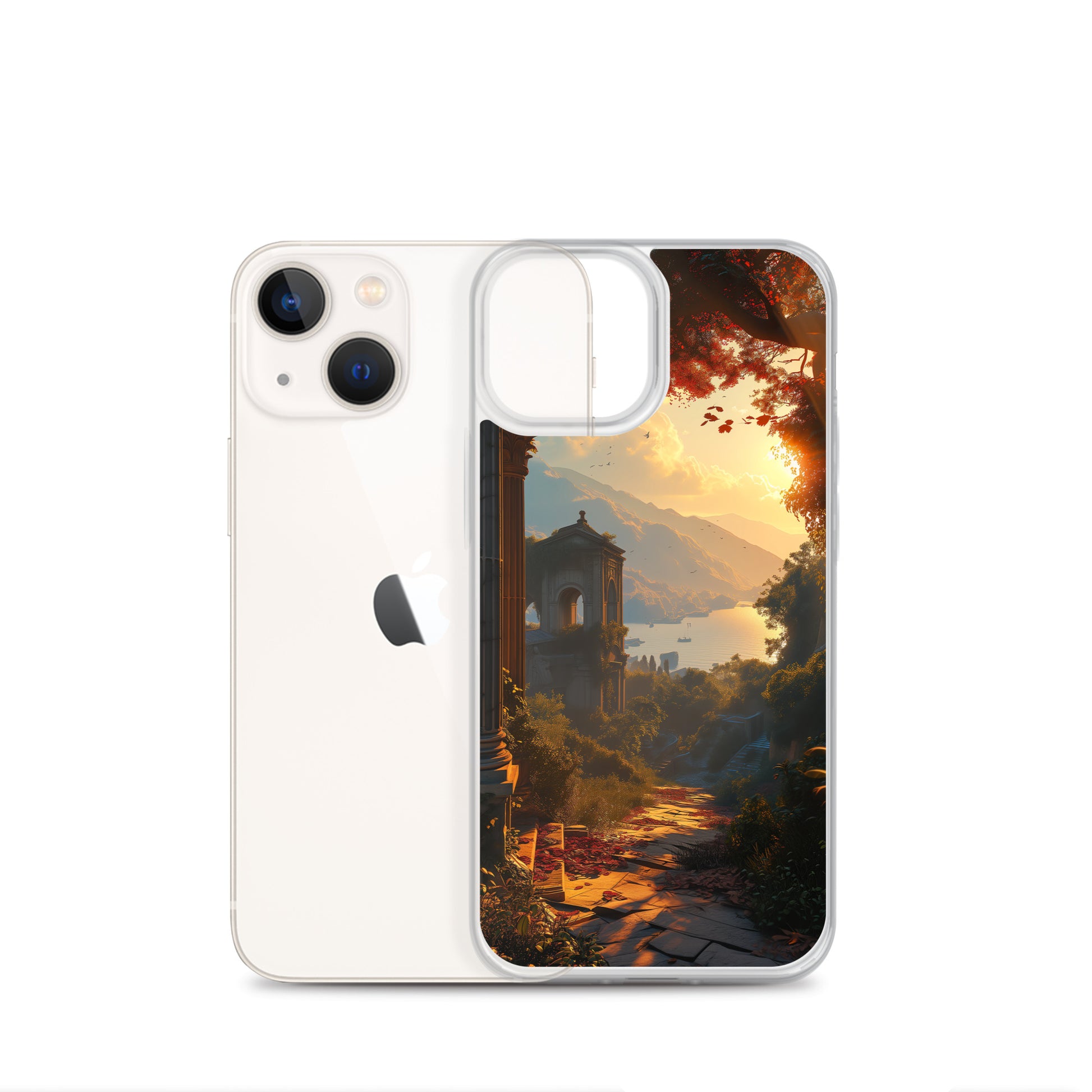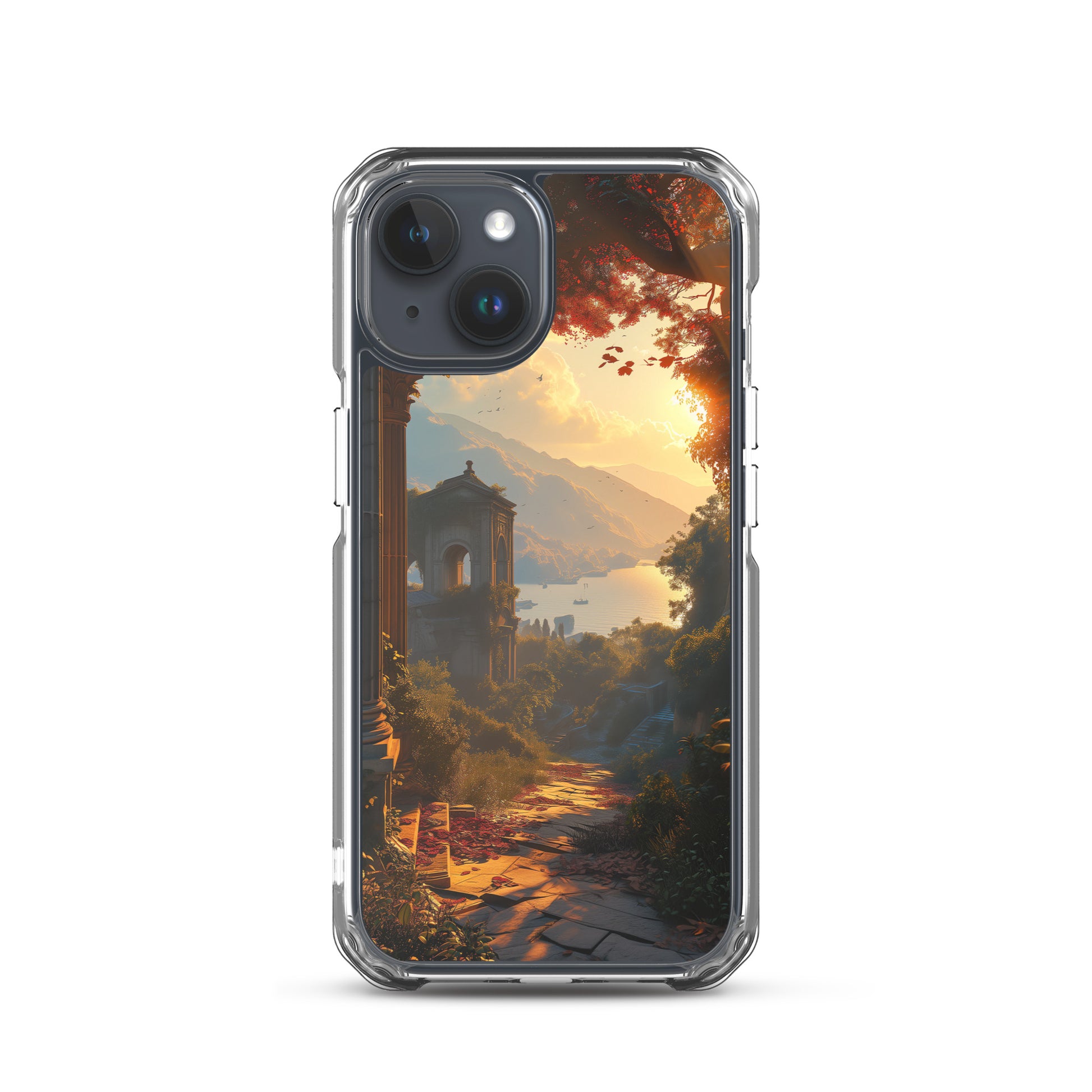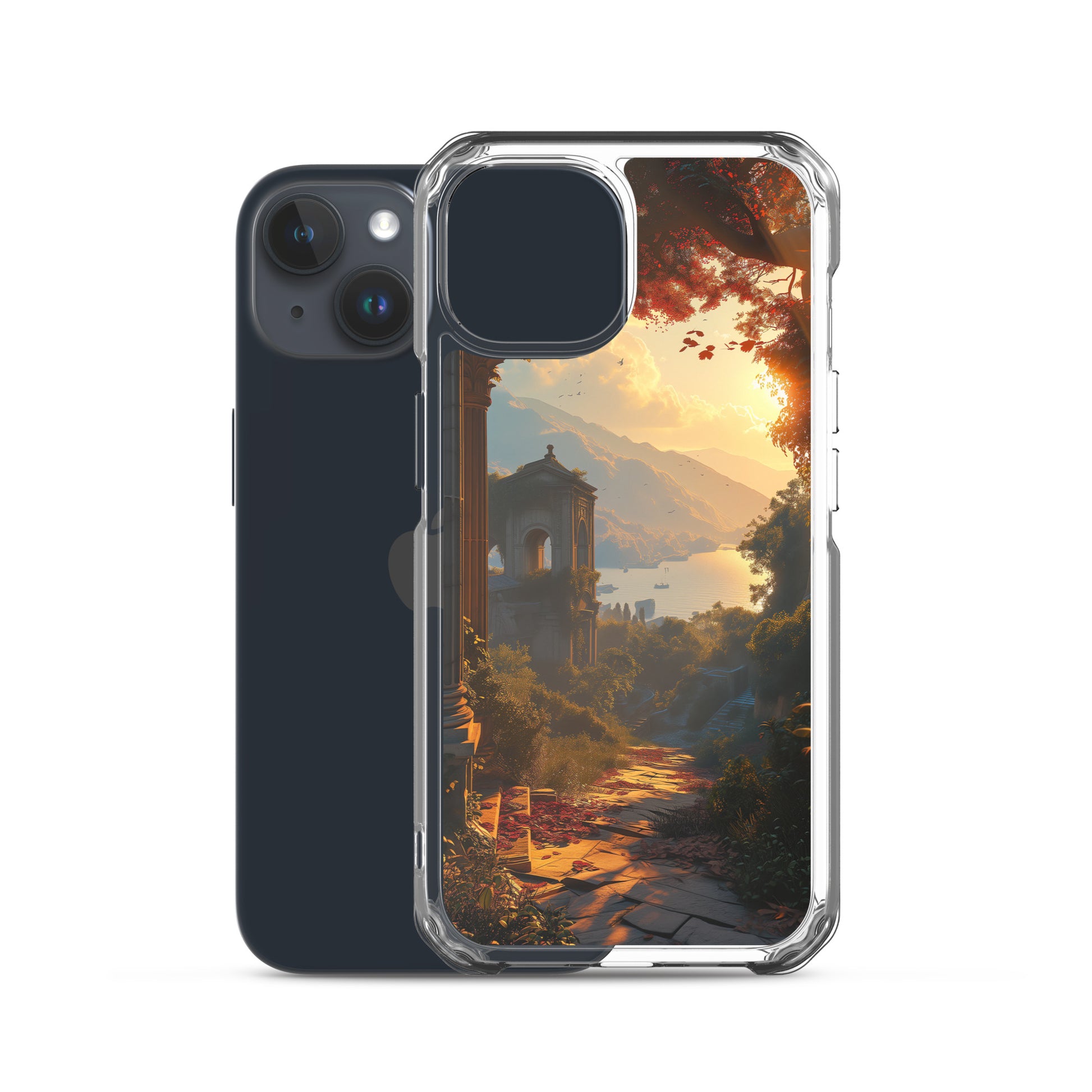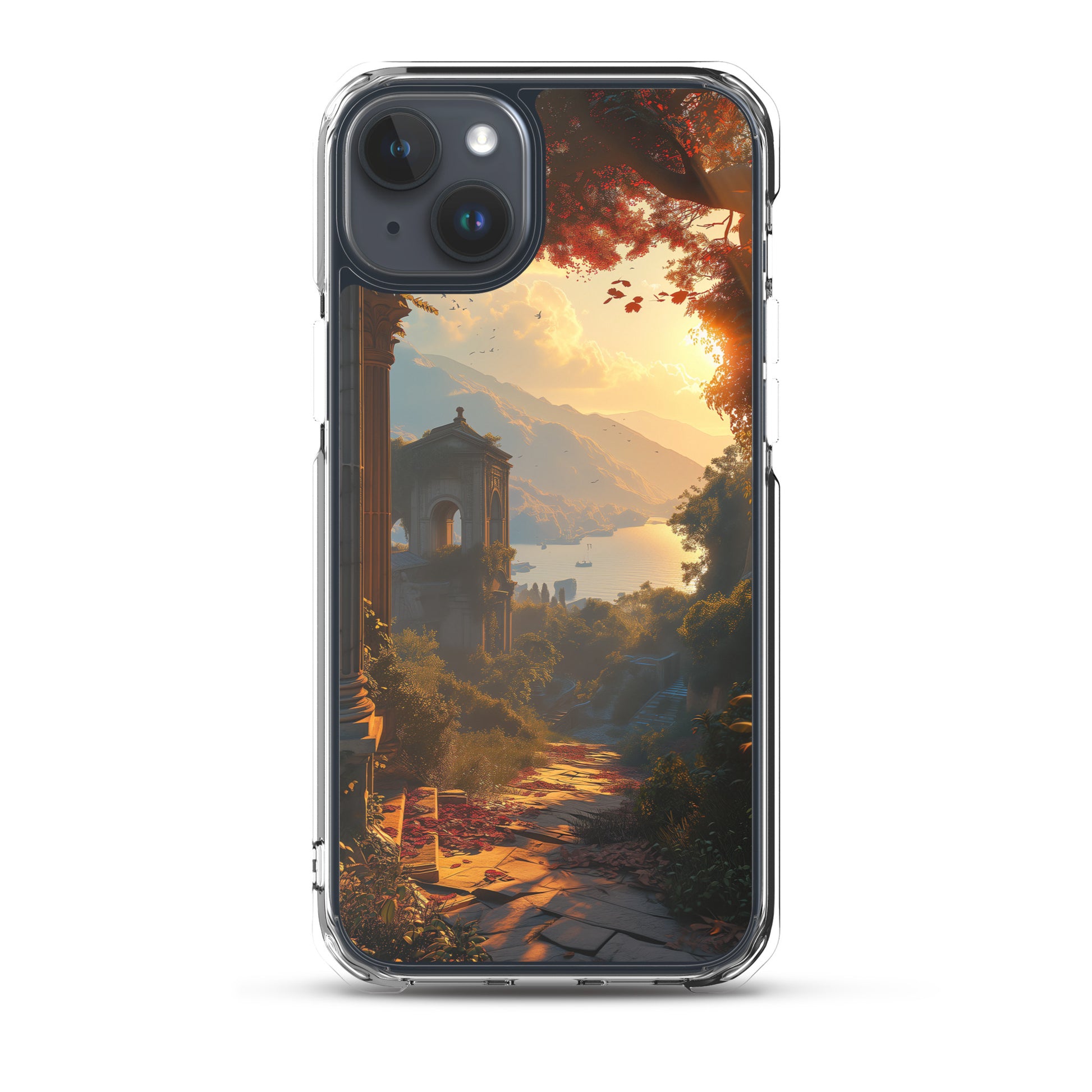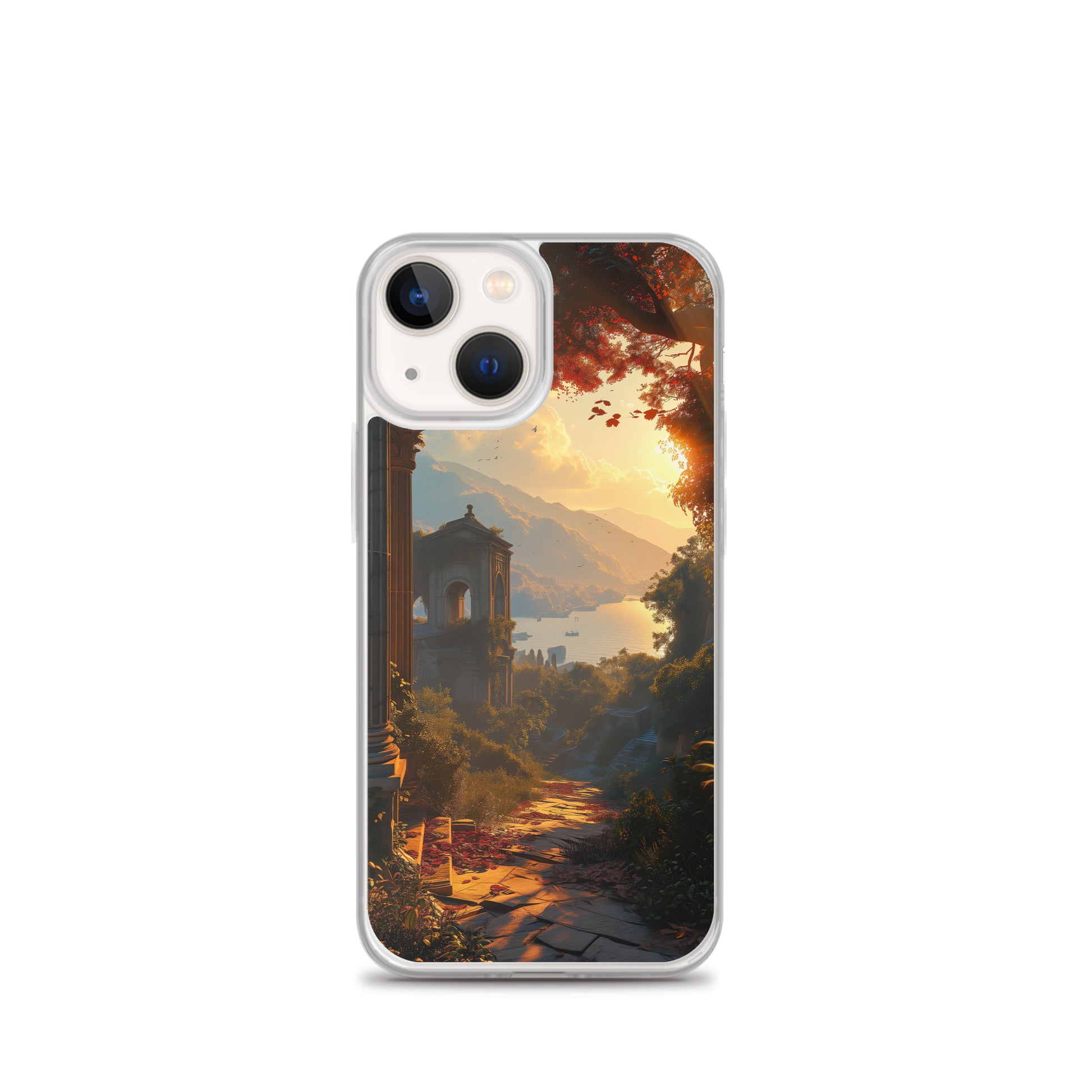 Sunset Over Sanctuary is an evocative design that portrays the tranquil beauty of an ancient temple at golden hour. The soft sun rays cascade through the foliage and classical architecture, highlighting the path to the sea beyond. This stunning piece captures the romance of old-world charm blended with the serene majesty of nature, making it a sublime addition to any collection. It's perfect for those who appreciate the spiritual beauty and the peaceful ambiance of sunset landscapes.