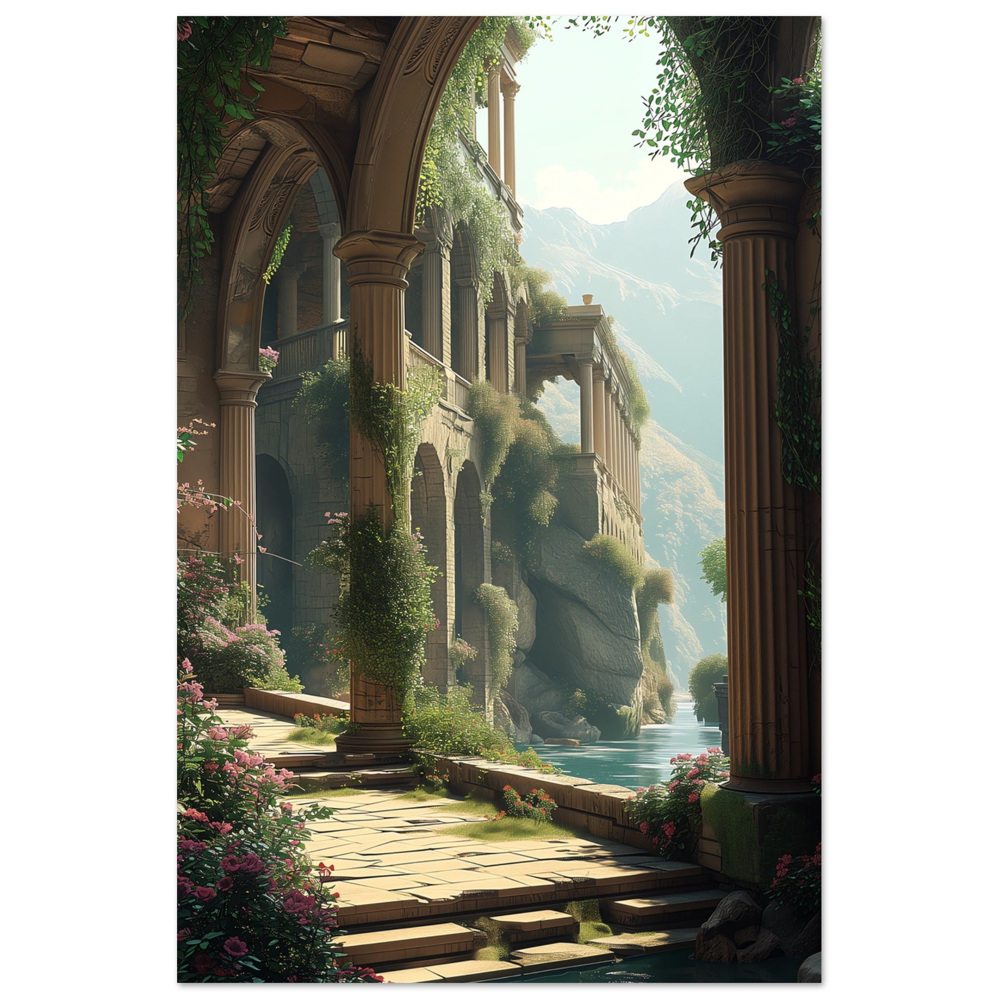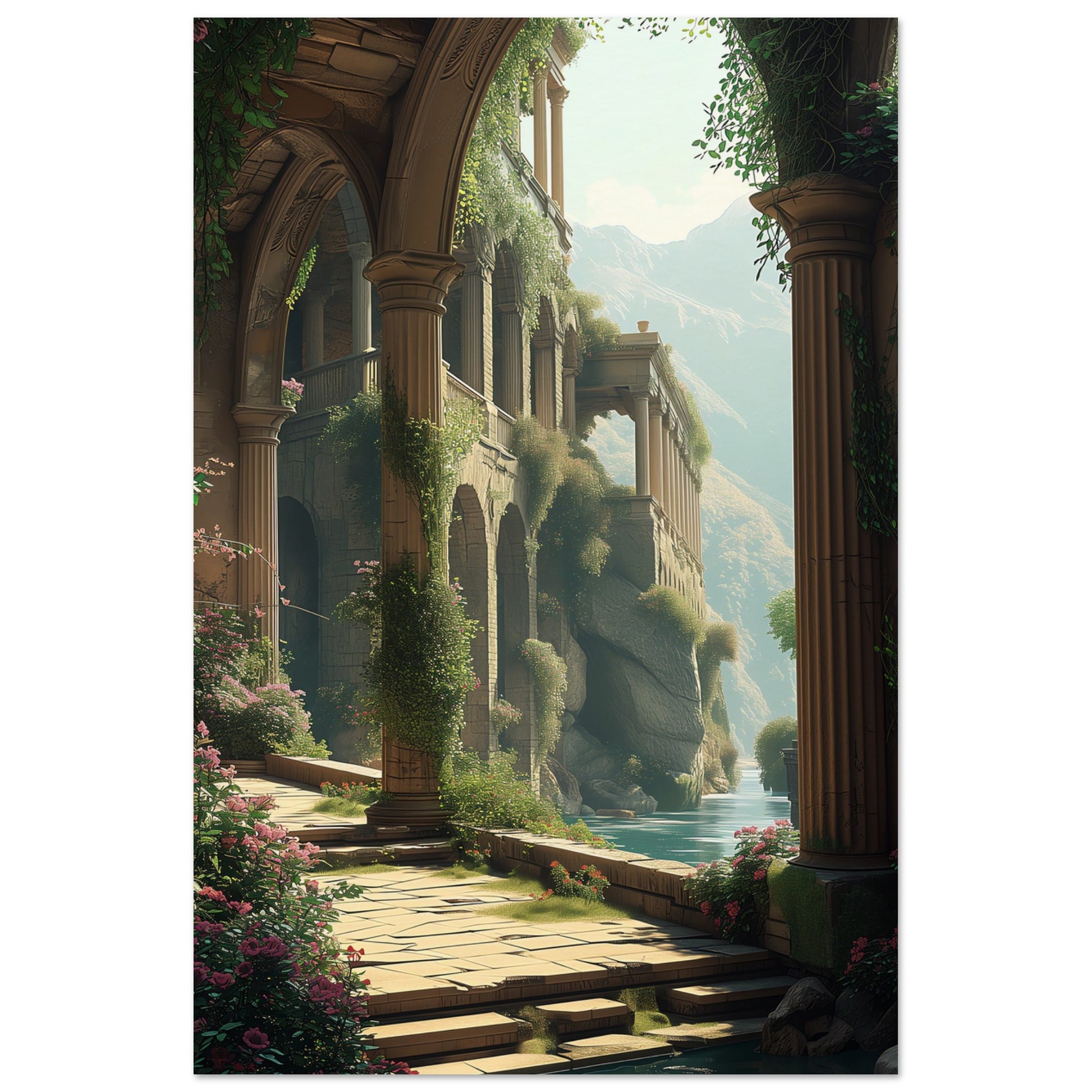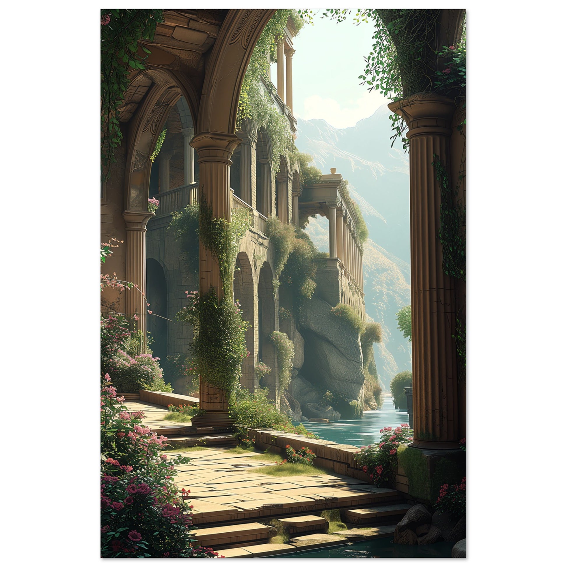 Arcadian Riverwalk is a magnificent design that depicts a serene riverside promenade, bordered by grand classical architecture and lush flora. The scene is a harmonious fusion of natural beauty and man-made splendor, inviting viewers to walk along the tranquil waters and experience a sense of timeless peace. This artwork is perfect for those who seek to bring the elegance of ancient paradises and the calm of riverine landscapes into their living or working spaces.