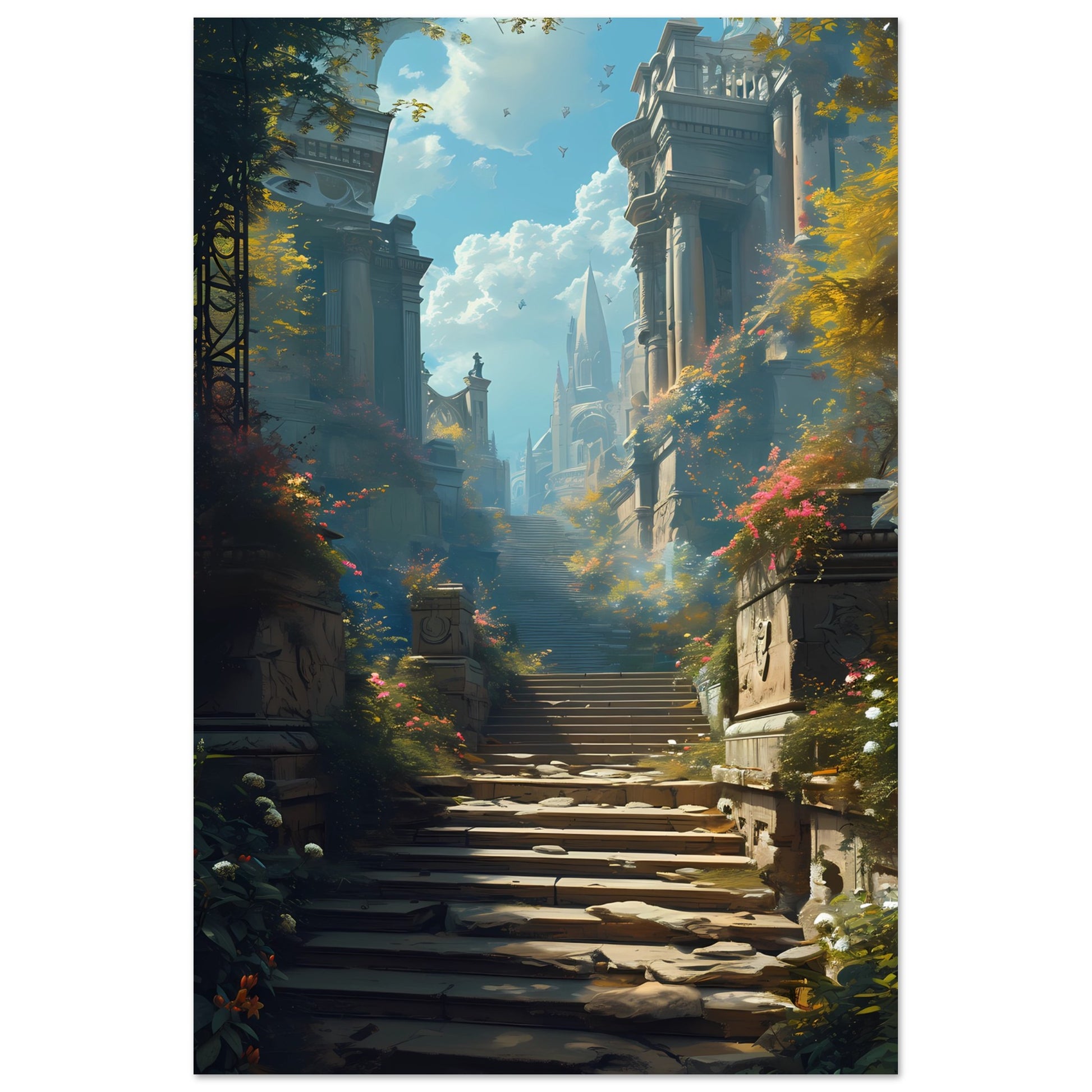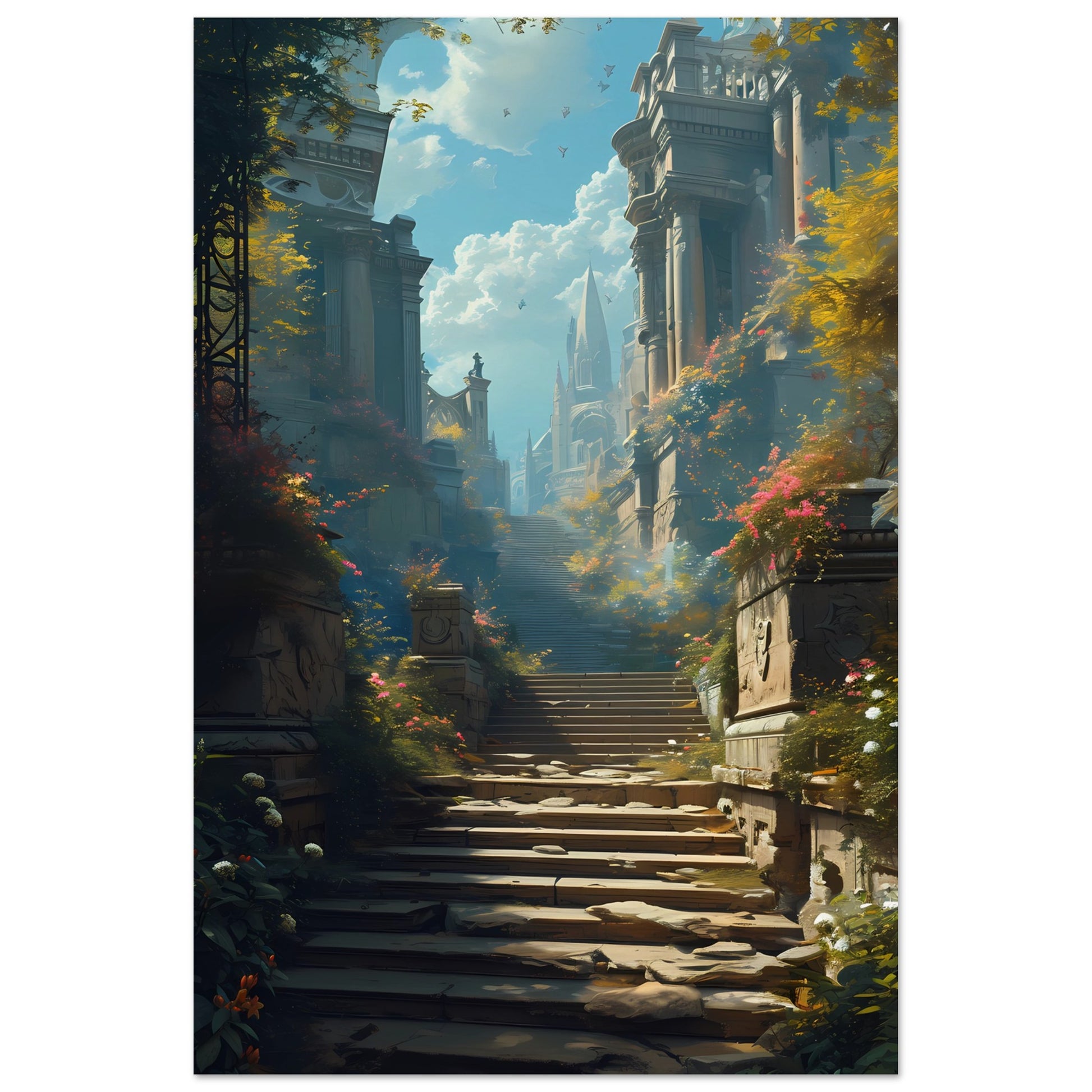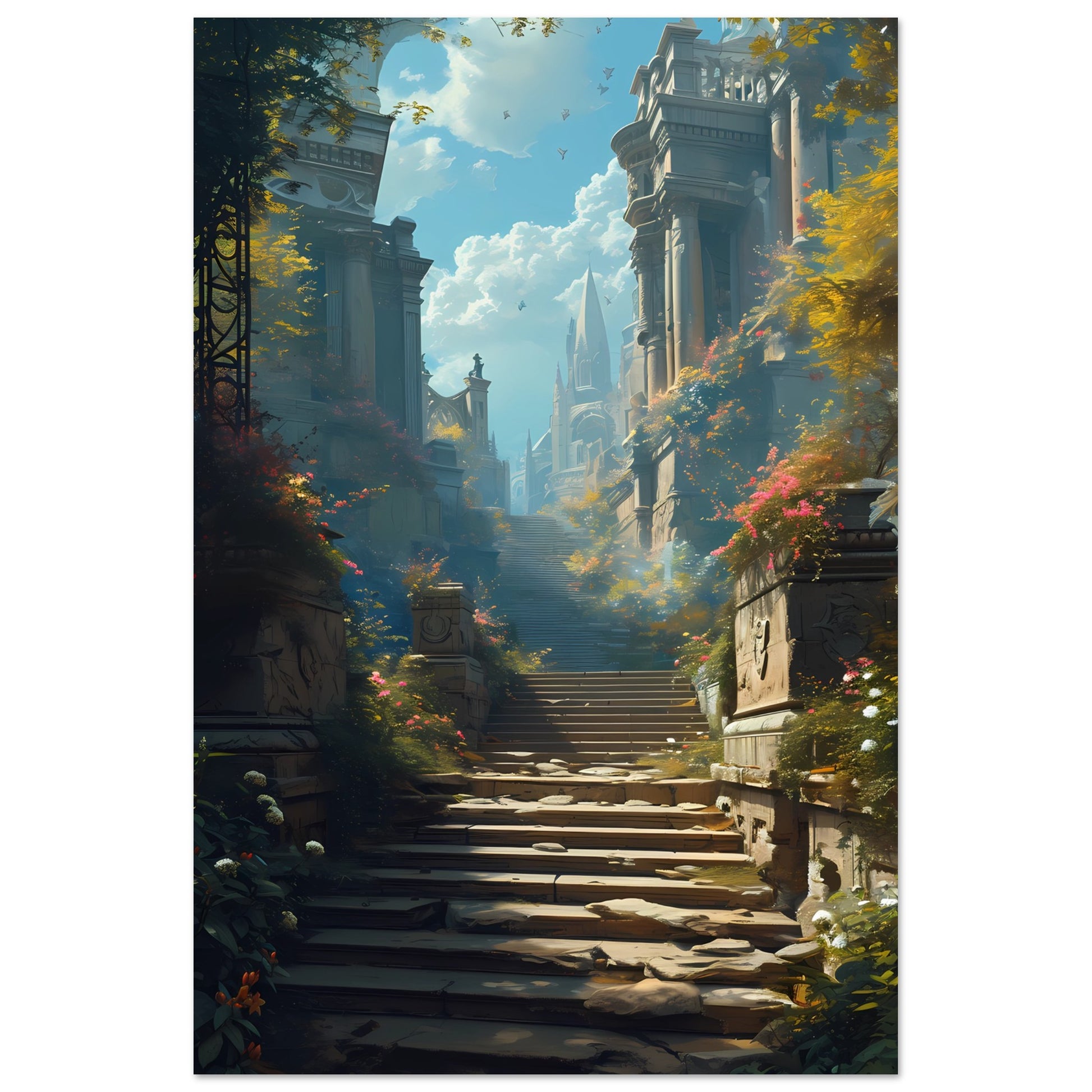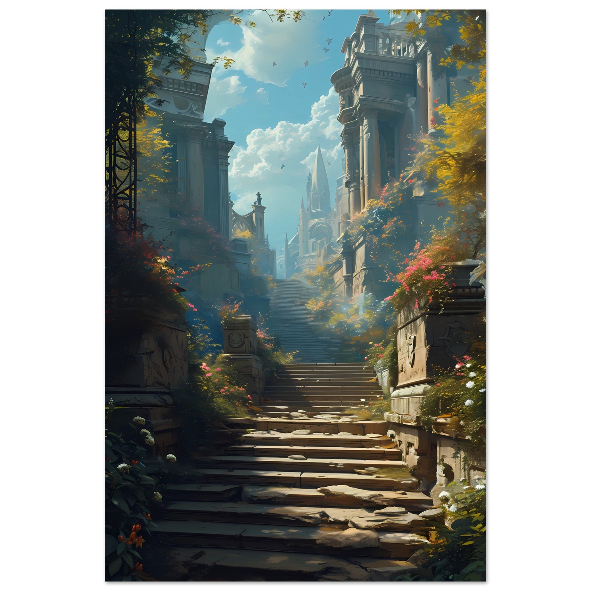 Ascend to Arcadia is a mesmerizing poster that invites viewers on a journey through a mythical realm. The scene unfolds with an ancient stairway, flanked by towering pillars and lush foliage, leading up toward a mystical city in the sky. The warm sunlight filters through the leaves, casting dappled shadows and illuminating the path forward. This piece of art is a gateway to a world of wonder, offering a daily escape into a serene, otherworldly paradise. It's perfect for dreamers and lovers of fantasy looking to add an element of enchantment to their walls.