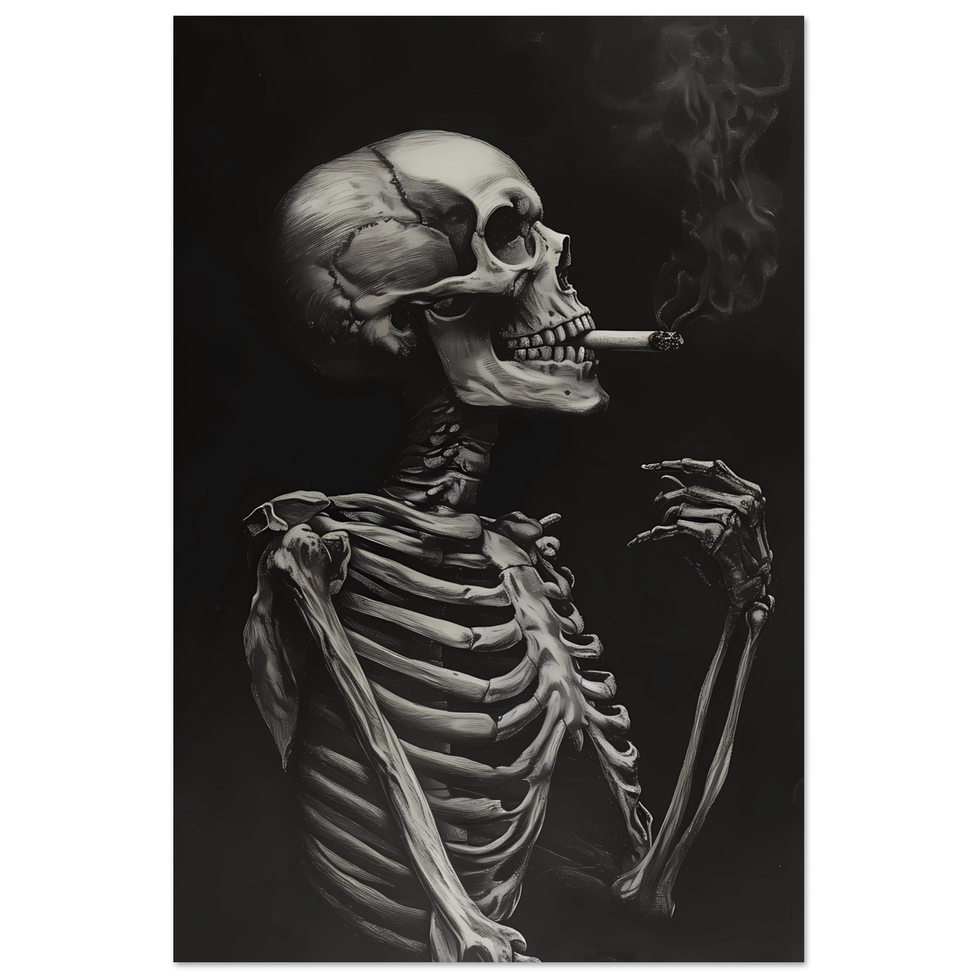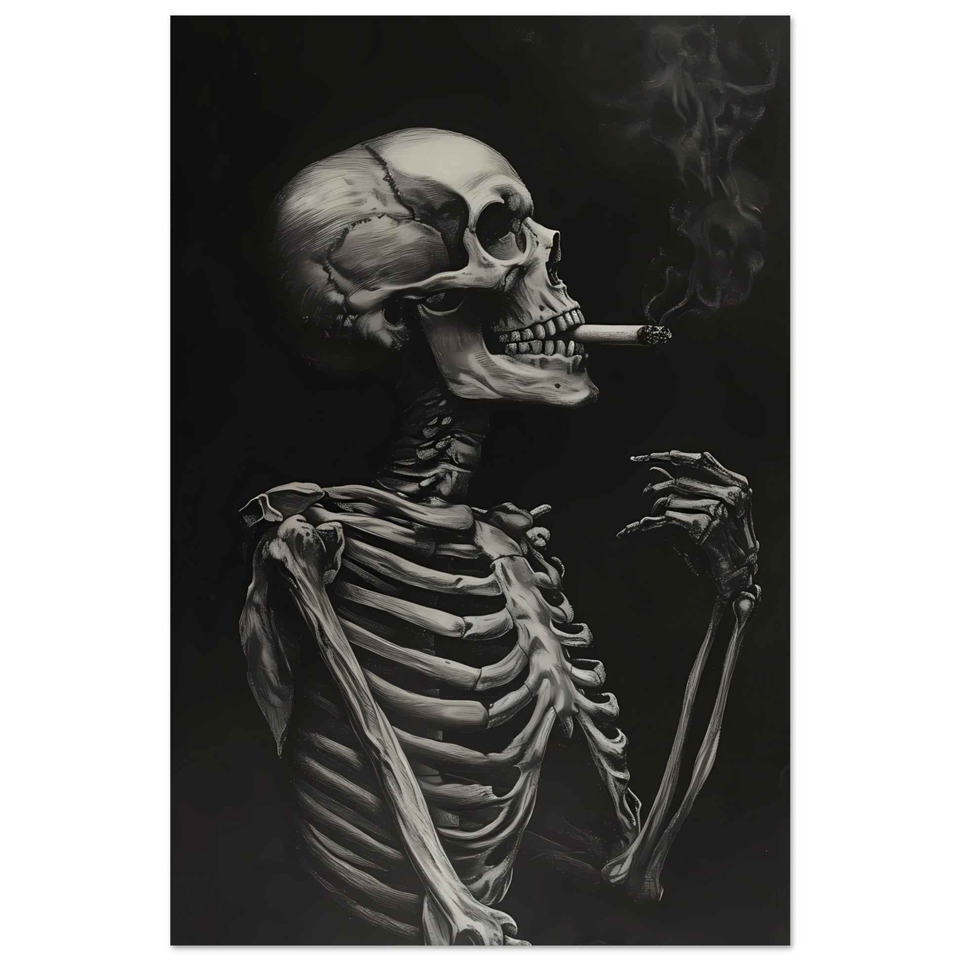 Contemplative Requiem is a profound and thought-provoking poster rendered in charcoal pencil style, showcasing a smoking skeleton in a moment of reflection. The monochrome palette emphasizes the stark contrast between life and death, while the intricate details of the bones and the delicate smoke wisps from the cigarette add depth and texture. This piece is a powerful artistic expression of existential contemplation, ideal for adding a touch of introspection and artistic flair to any space.