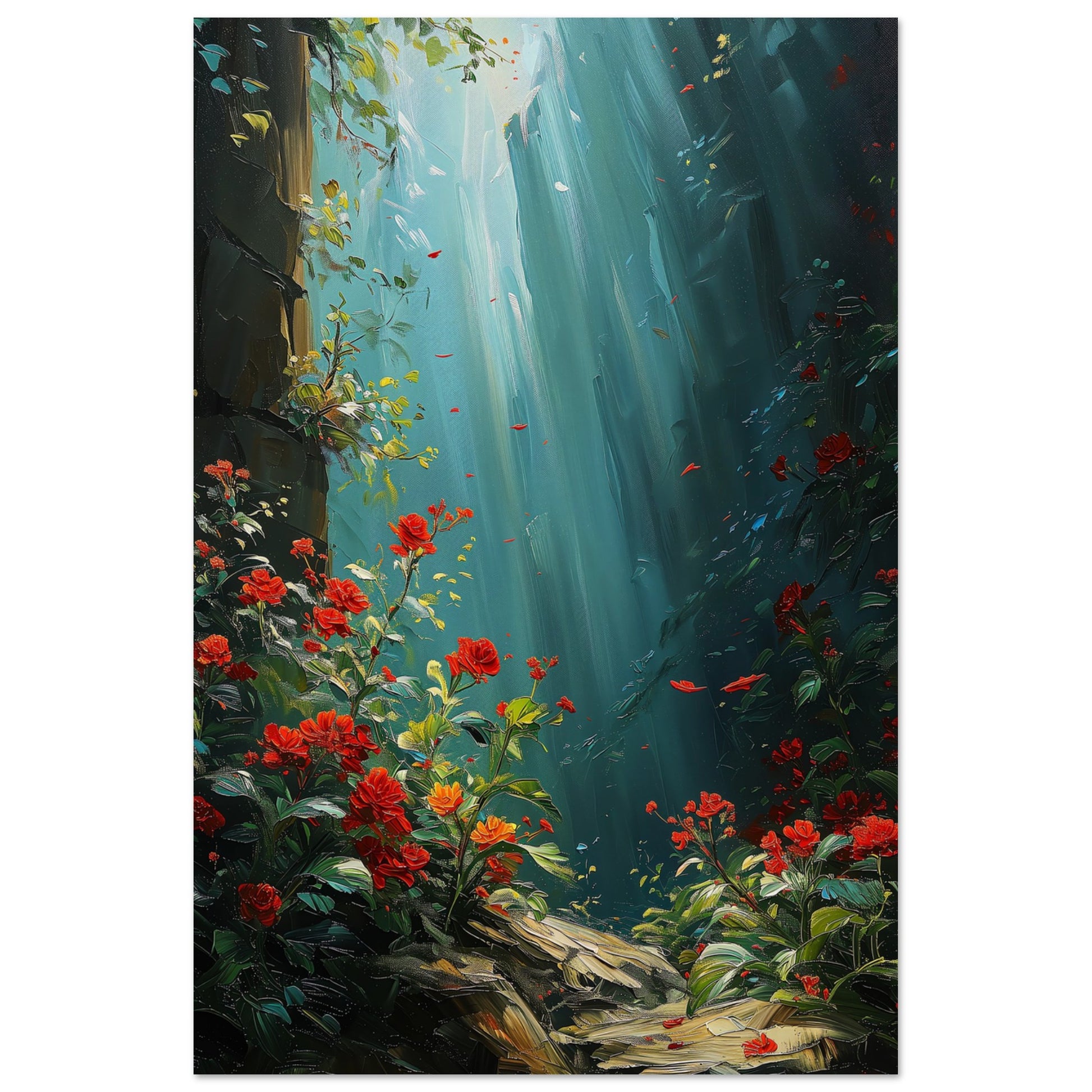 Heavenly Cascade is a breathtaking design that captures a secluded waterfall oasis, where the dance of light and shadow creates a tranquil sanctuary. The lush foliage, adorned with vibrant red flowers, frames the gentle falls, inviting the onlooker to a place of peace and natural splendor. This piece is a celebration of nature's serene moments and would make a perfect addition to any space that seeks to inspire calm and introspection.