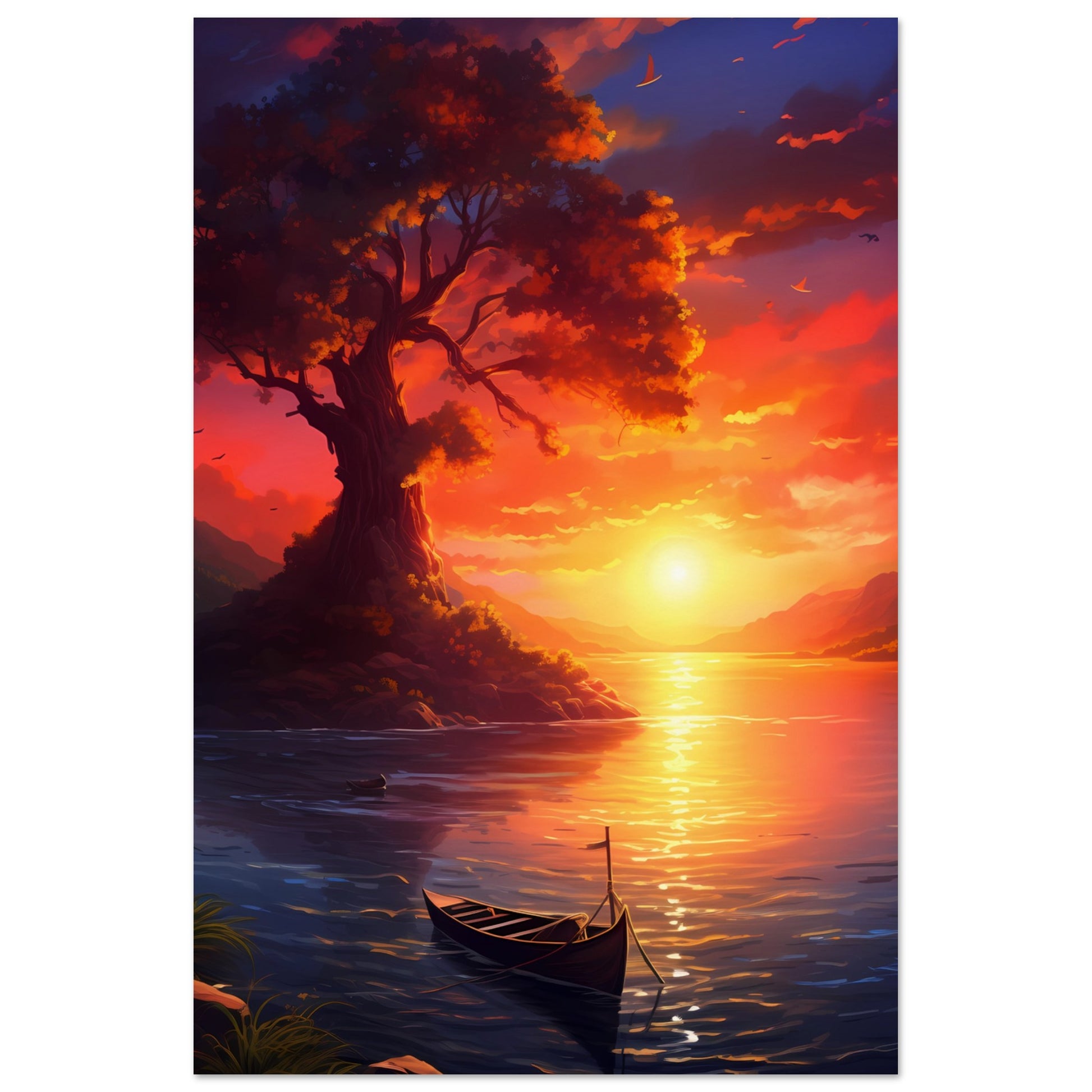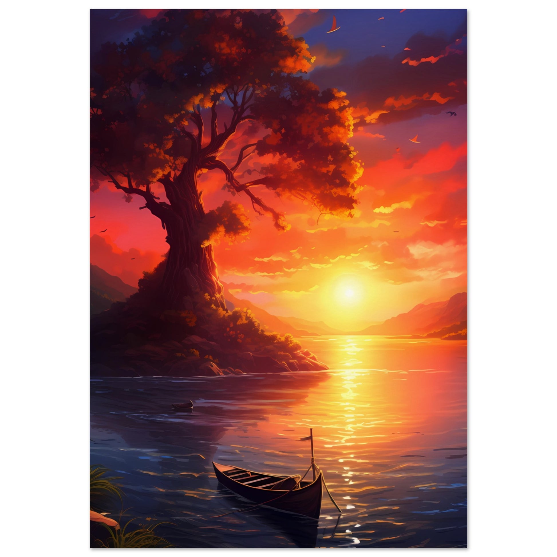 Embark on a journey of solitude with the "Solitary Sunset Serenade" phone case design. A lone tree stands tall on a rocky outcrop, bathed in the radiant glow of the setting sun. The calm waters, the drifting boat, and the fiery sky converge to create a symphony of colors, evoking feelings of peace and nostalgia.