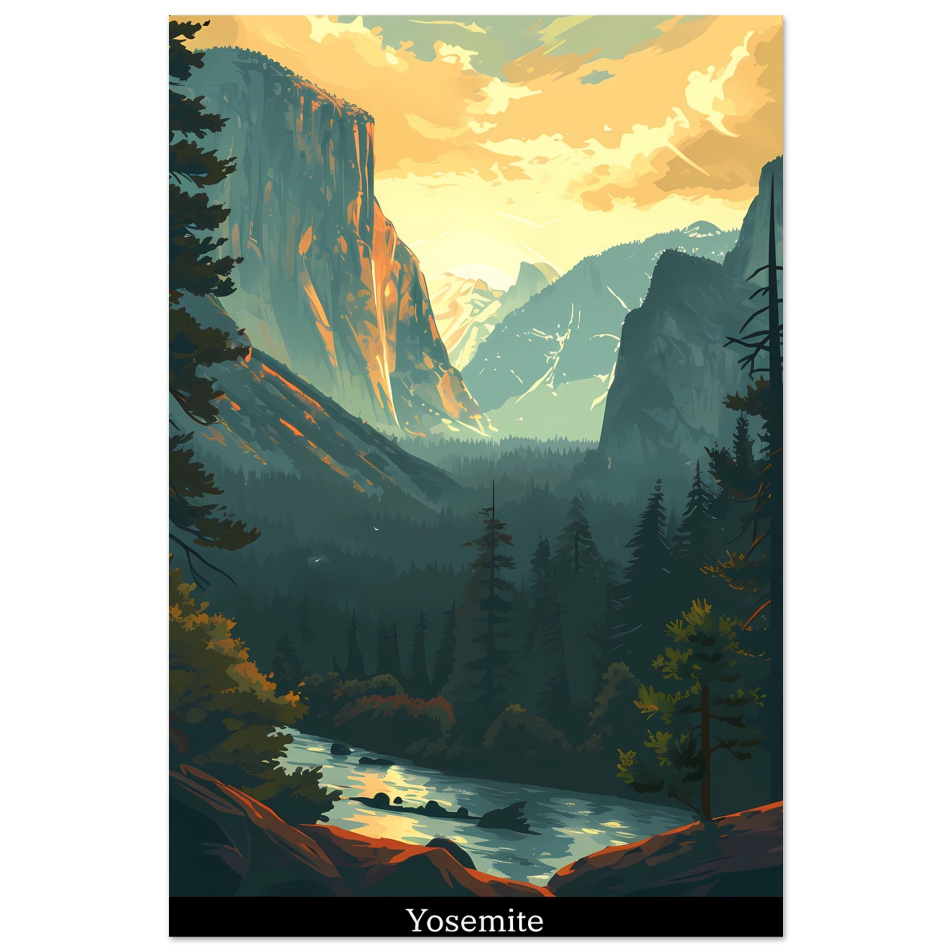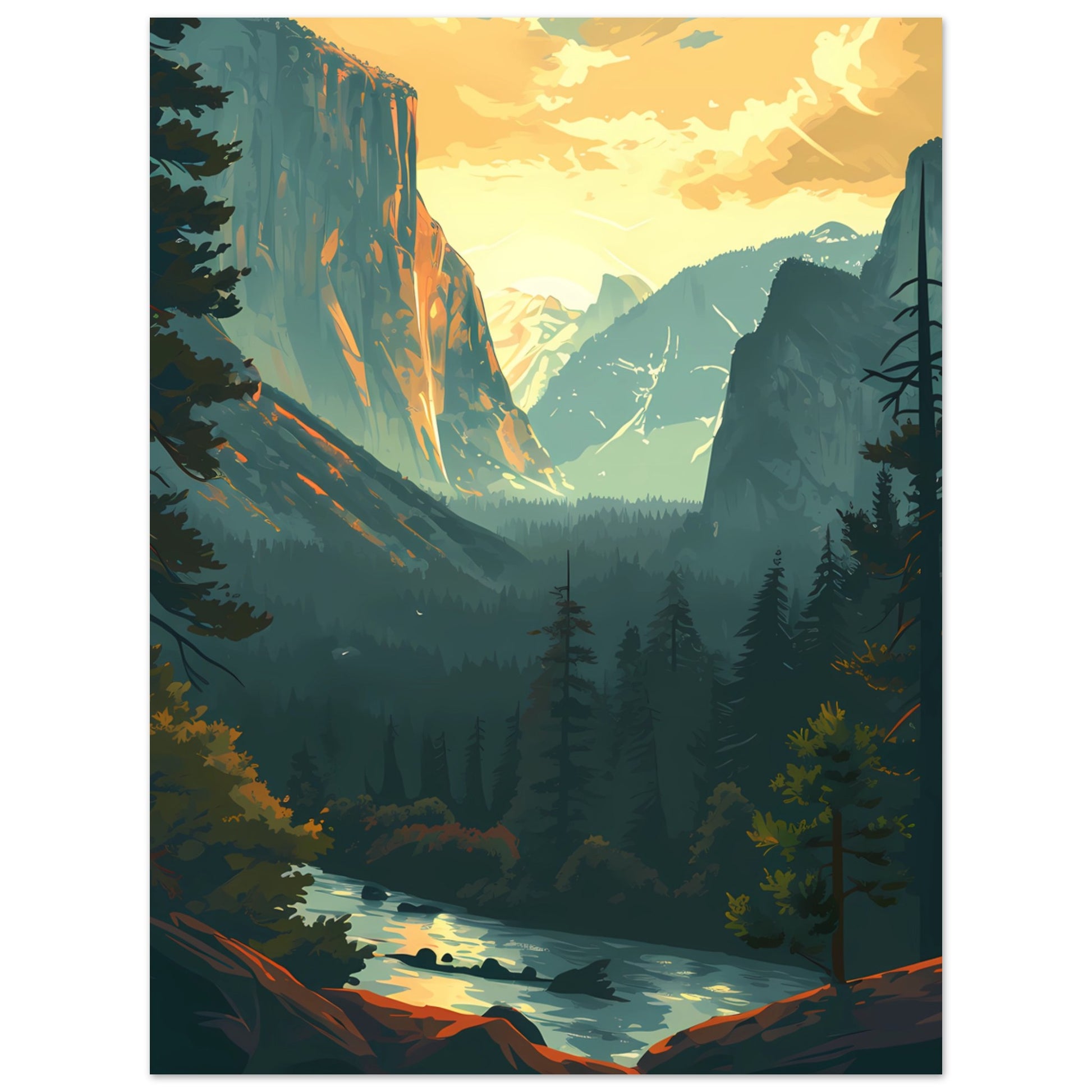 This exquisite poster captures the stunning beauty of Yosemite National Park in a minimalist vector design that is both modern and timeless. The artwork showcases the iconic cliffs and sweeping valleys of Yosemite, rendered in a vibrant color palette that evokes the warm hues of sunset.